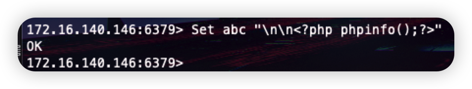 Set abc "nn<?php phpinfo();?>" //写入,这里还有一种写法:set abc”nn<xxx>”nx,末尾的nx代表仅当键abc不存在的时候,才会创建。这样可以防止误更新到业务在用的键名,引发业务的异常。 |