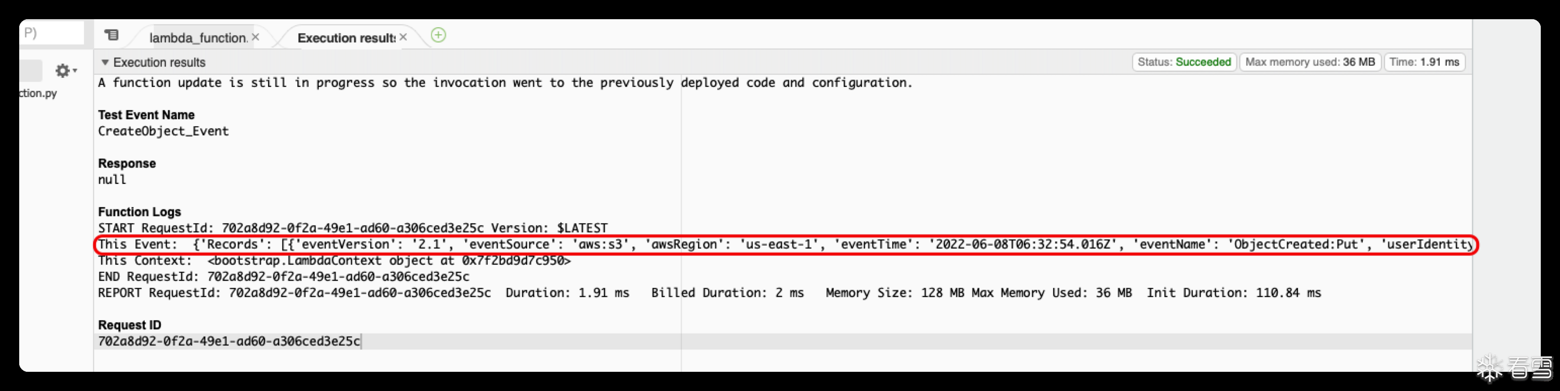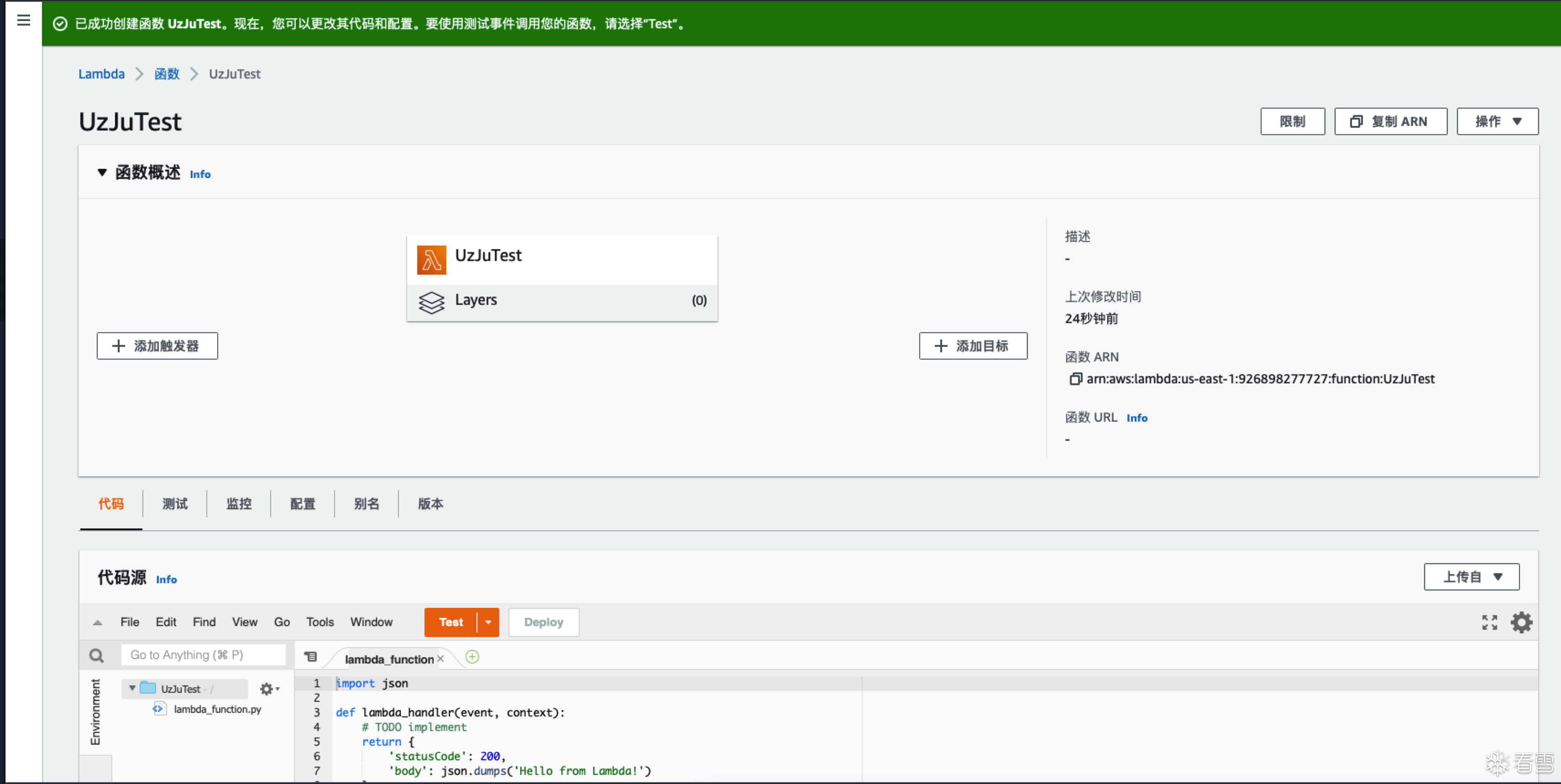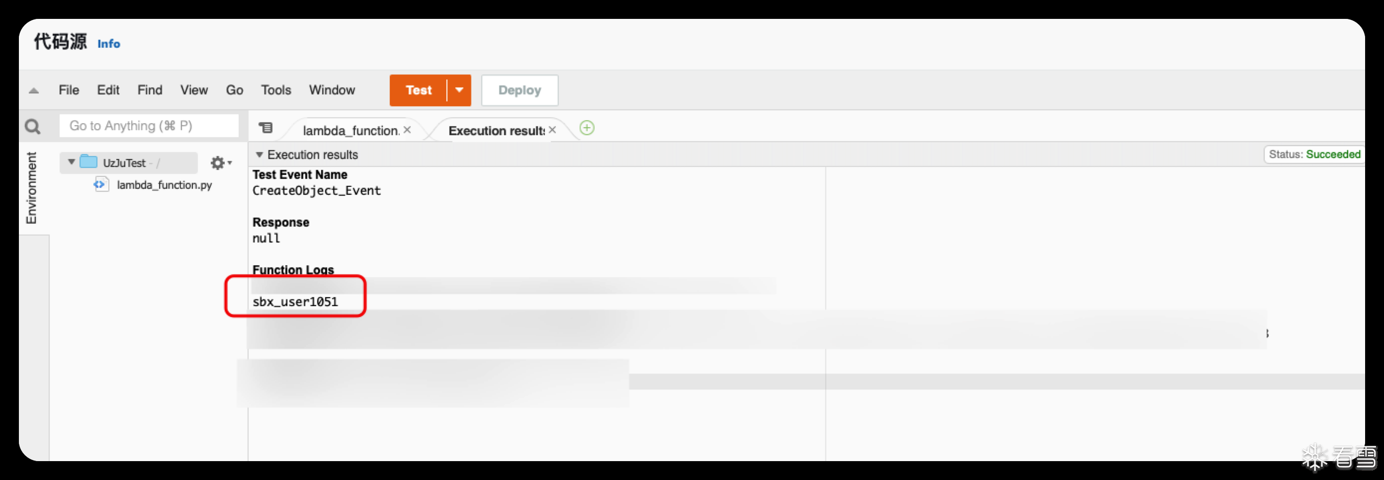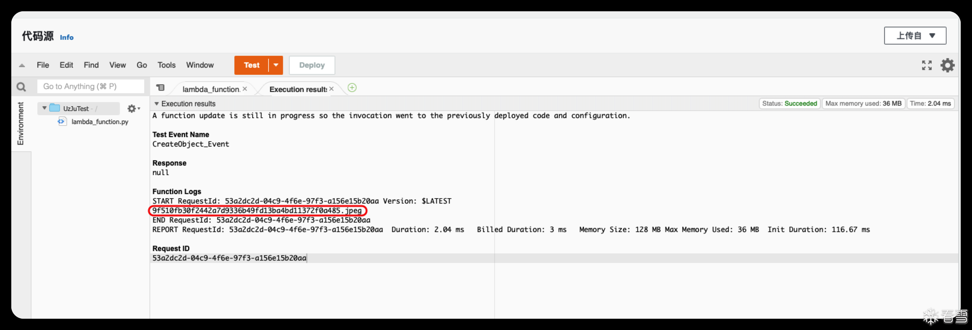 将这个代码更新到lambda函数中,随后运行Test