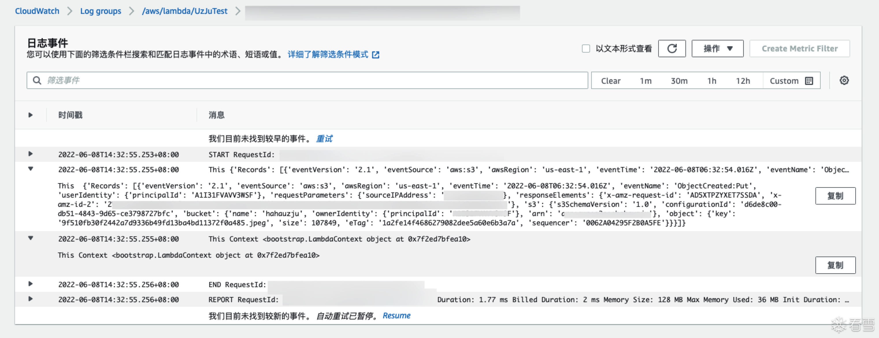 随后在cloud watch中就可以看到上传的日志