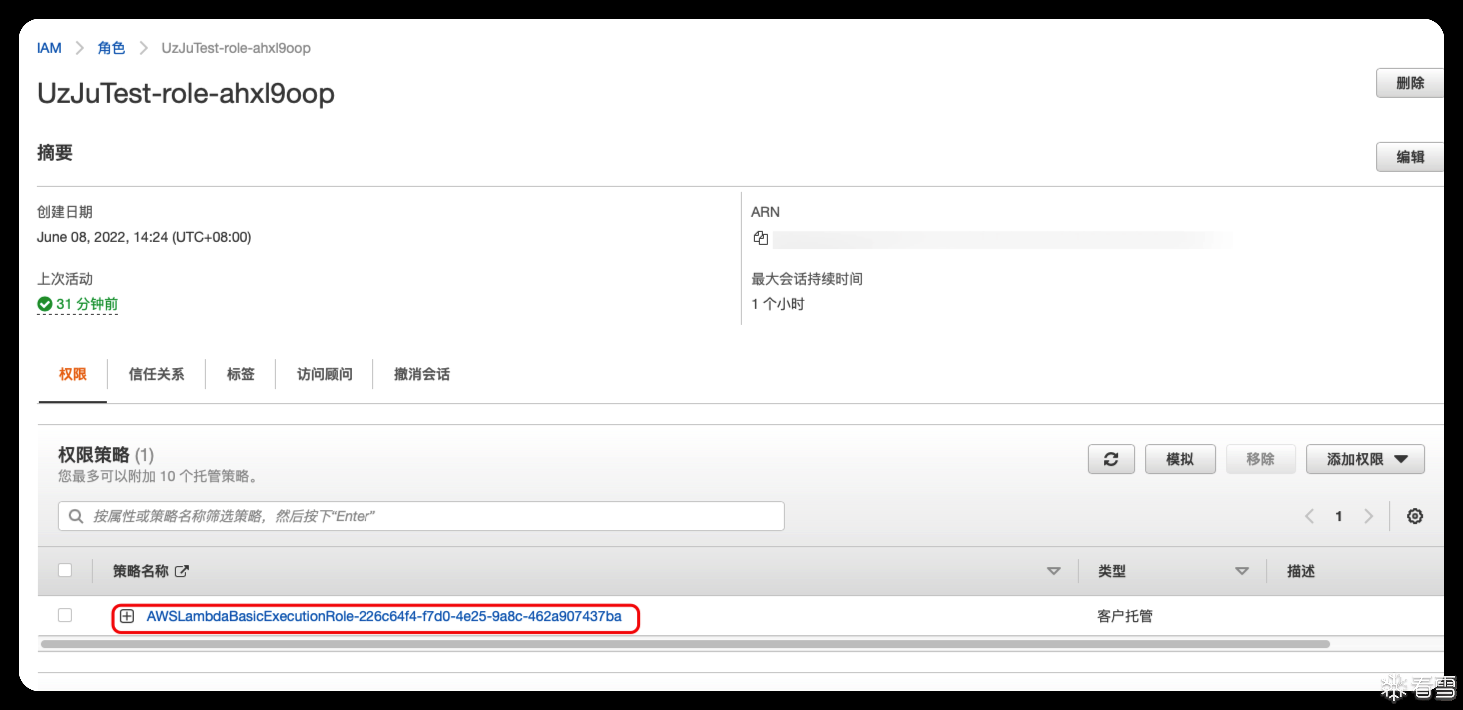 但是这里有这么多的API,怎么知道这个KEY有什么权限呢?这就需要切换到白盒的方式,因为创建lambda函数的时候,所有的配置都是用的默认的,这个时候,只需要确定默认配置创建的IAM给的权限是多少即可