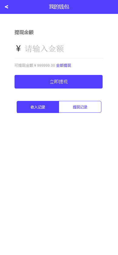 我的钱包:账户余额,提现收款码(线下转账),收入记录,提现记录