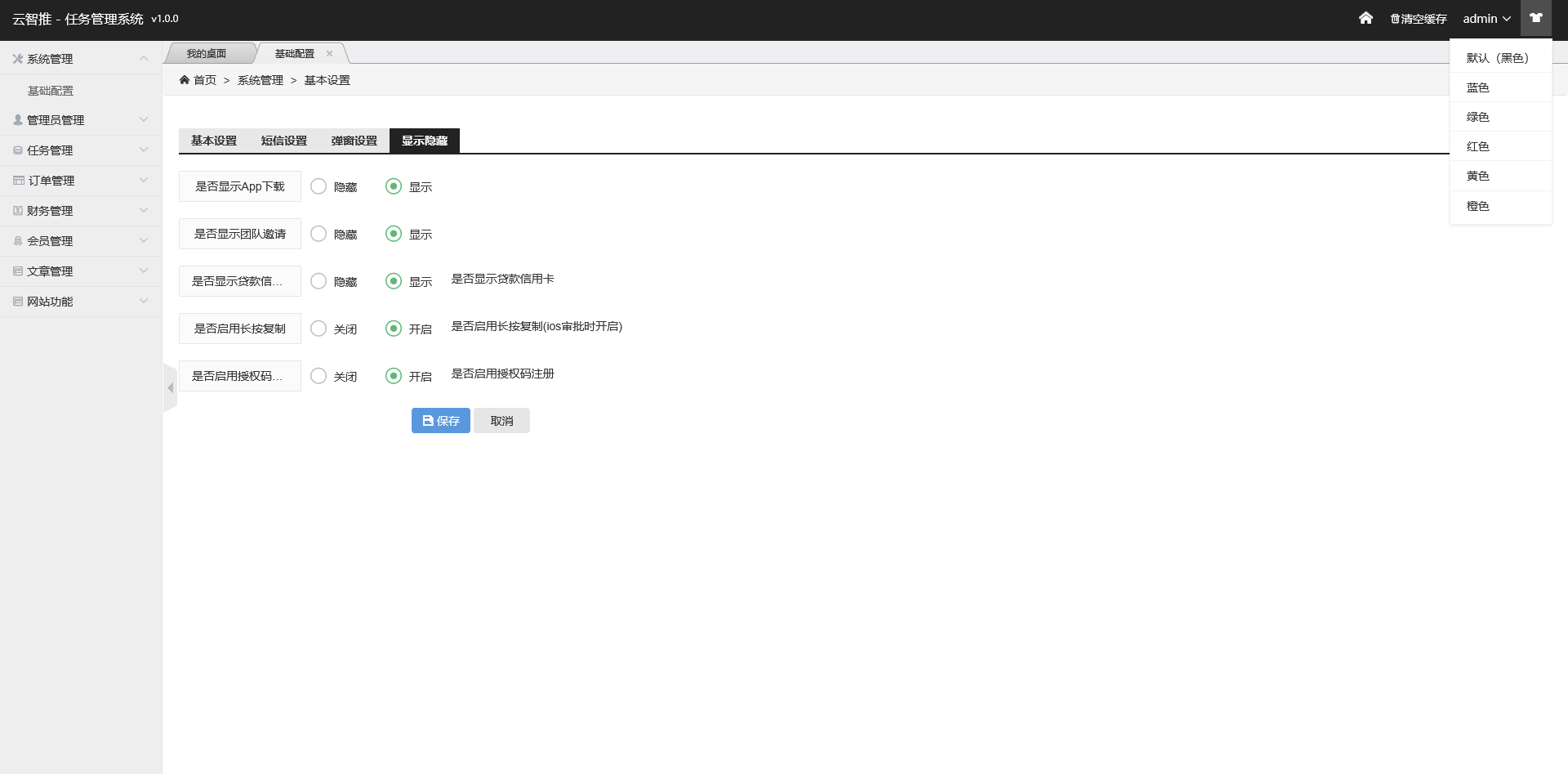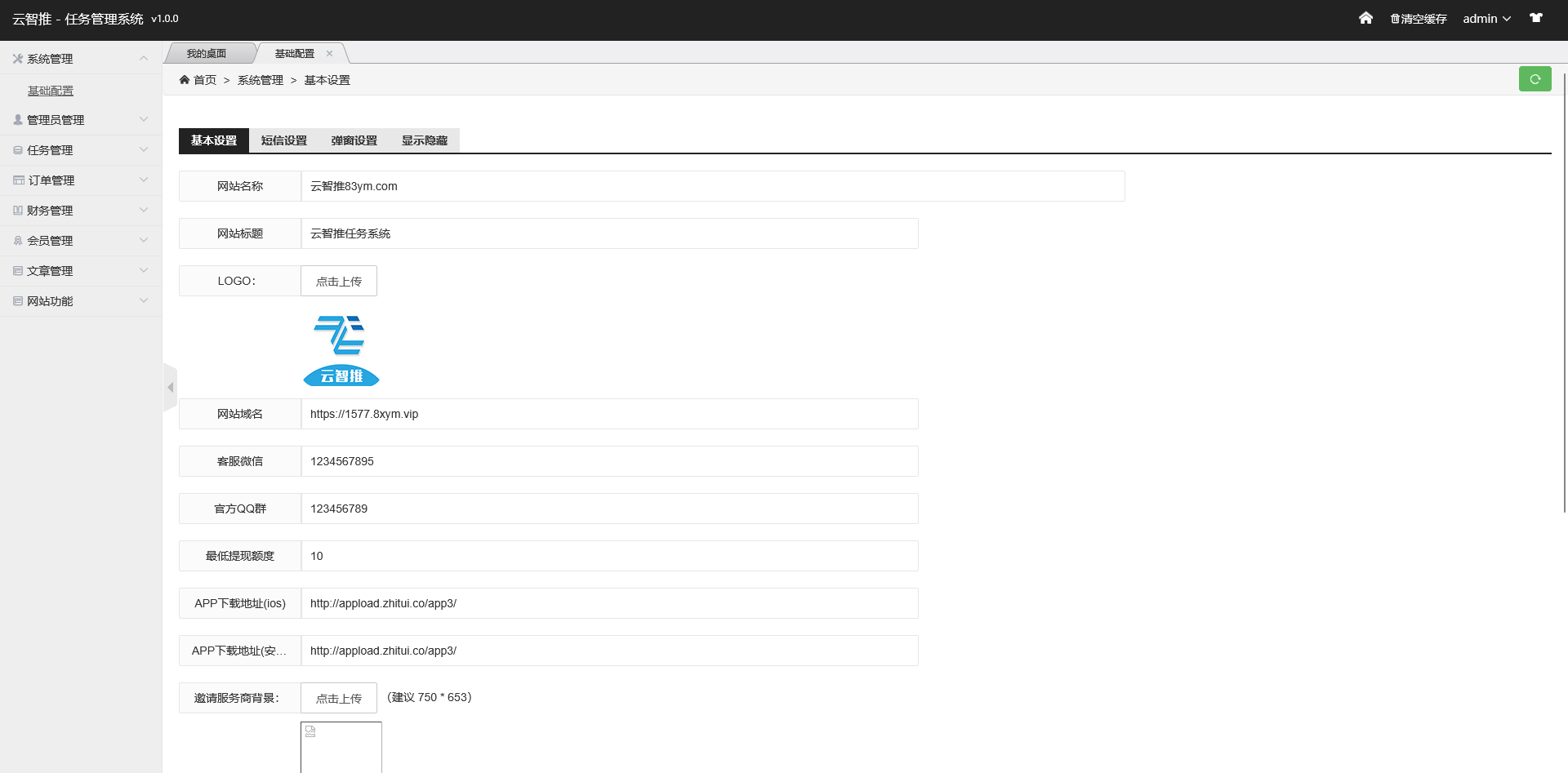 系统设置:logo,APP 下载链接,推广海报,客服,弹窗广告,是否使用邀请码等设置
