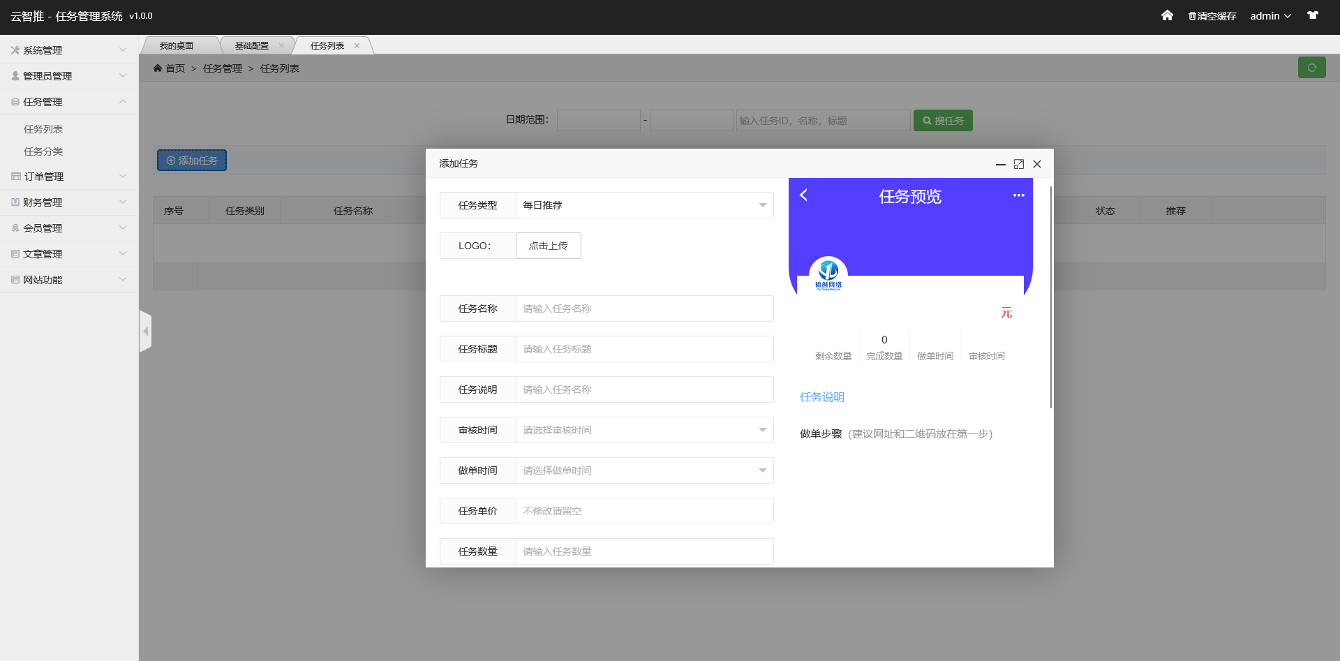 任务管理:添加查询任务,上下架,推荐任务,编辑删除任务,任务客服设置,任务步骤流程完全自定义,任务分类自定义编辑