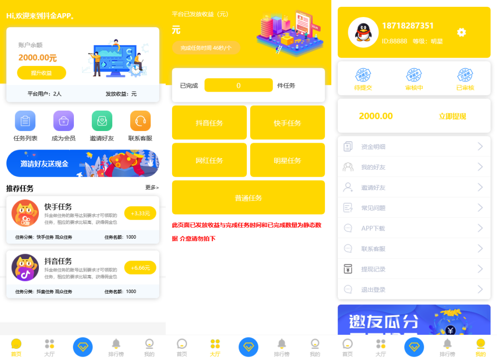 员工账号:员工做单做单金额都到上级账号,上级可线下结算给员工账号。员工账号自己看不到任务的价格和做单的金额,不能邀请下