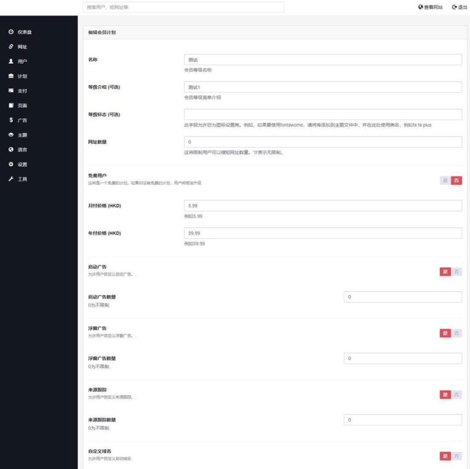 系统内置会员等级与付费计划,用户可通过升级获得更多高级功能,如像素跟踪、自定义跳转页、叠加页面、API扩展等。