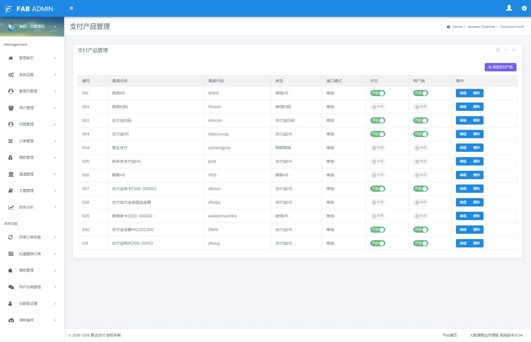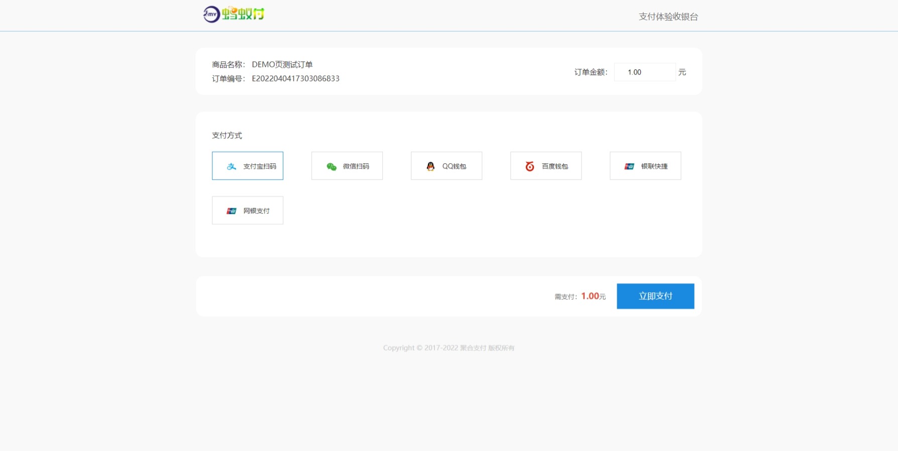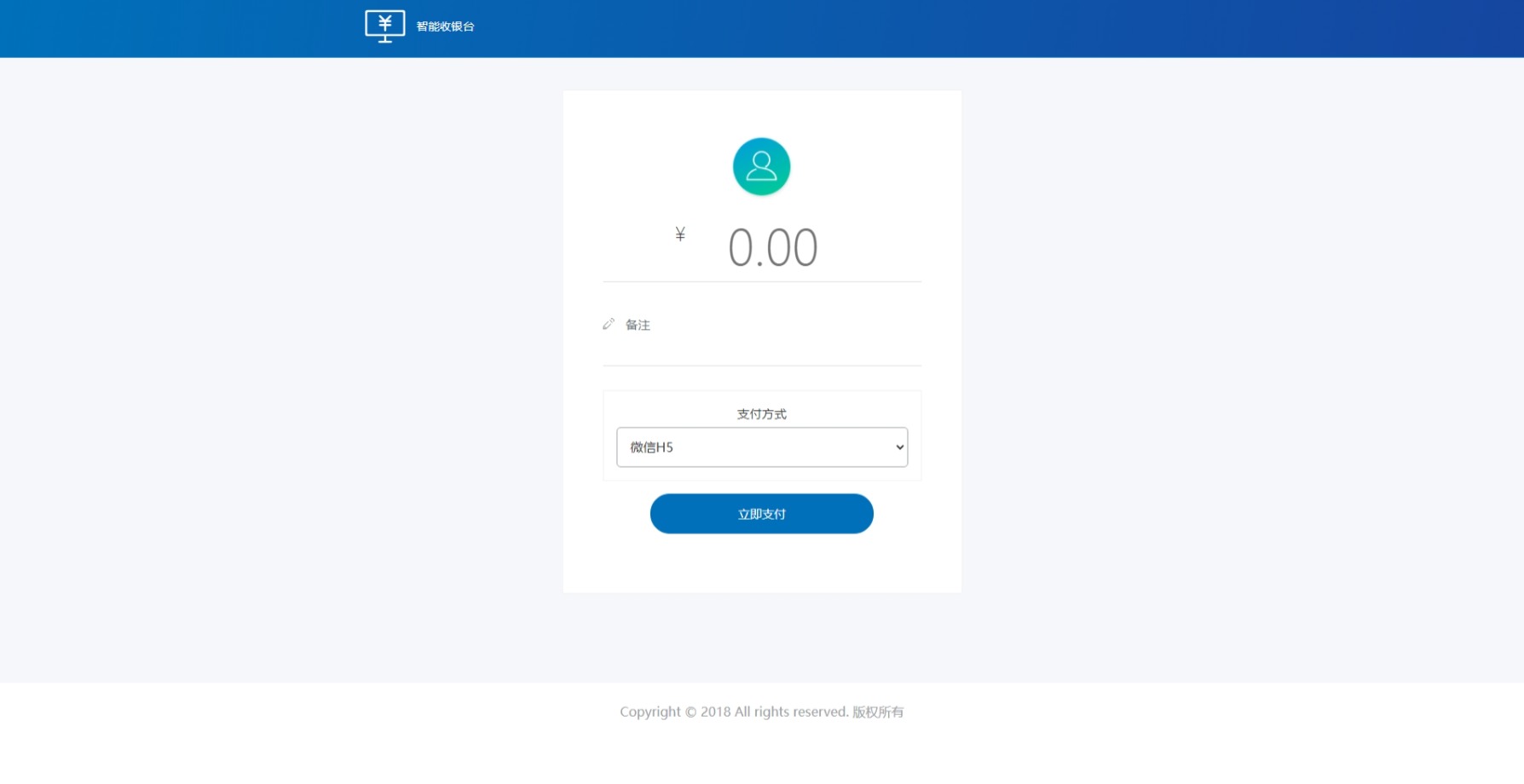 支持 微信H5、当面付、公众号支付、支付宝扫码、银联快捷支付 等;