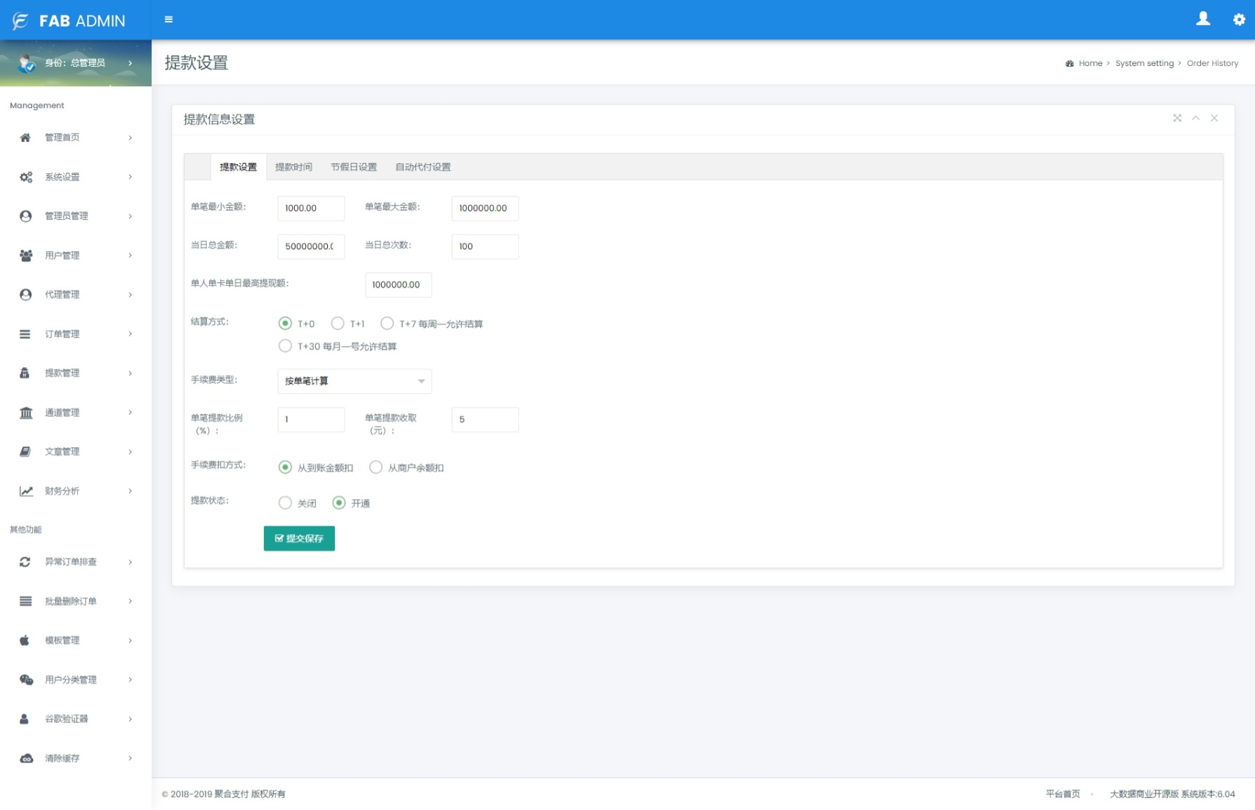 支持 普通结算、自动代付结算、手动结算 三种模式;