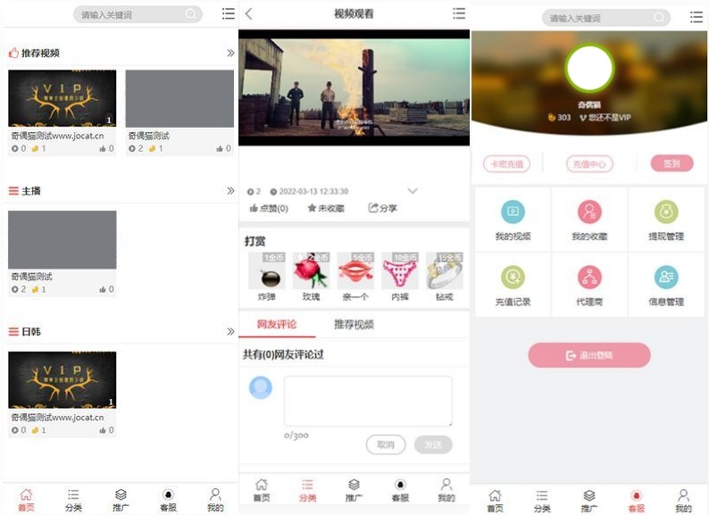 支持推流直播、短视频上传、观看记录、收藏、签到。