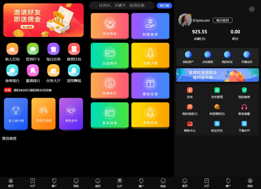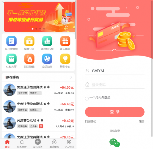 仿蚂蚁帮扶众人帮悬赏任务系统源码 是一款支持 H5网页端与APP封装端 的多功能网赚任务平台源码,采用 PHP+ThinkPHP框架开发,界面UI仿蚂蚁帮扶/众人帮最新版本,功能完善、性能稳定,可直接上线运营。