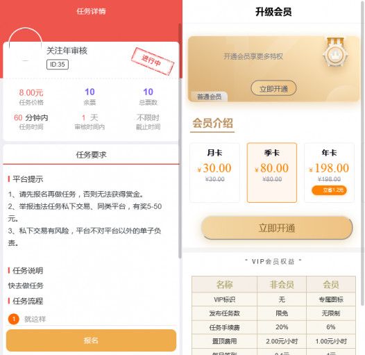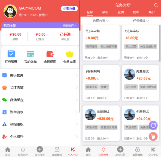 支持任务置顶、付费推荐、红包浏览任务;