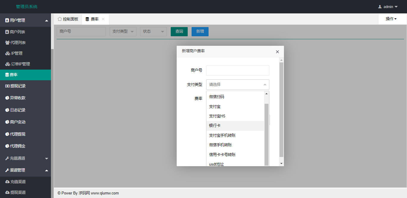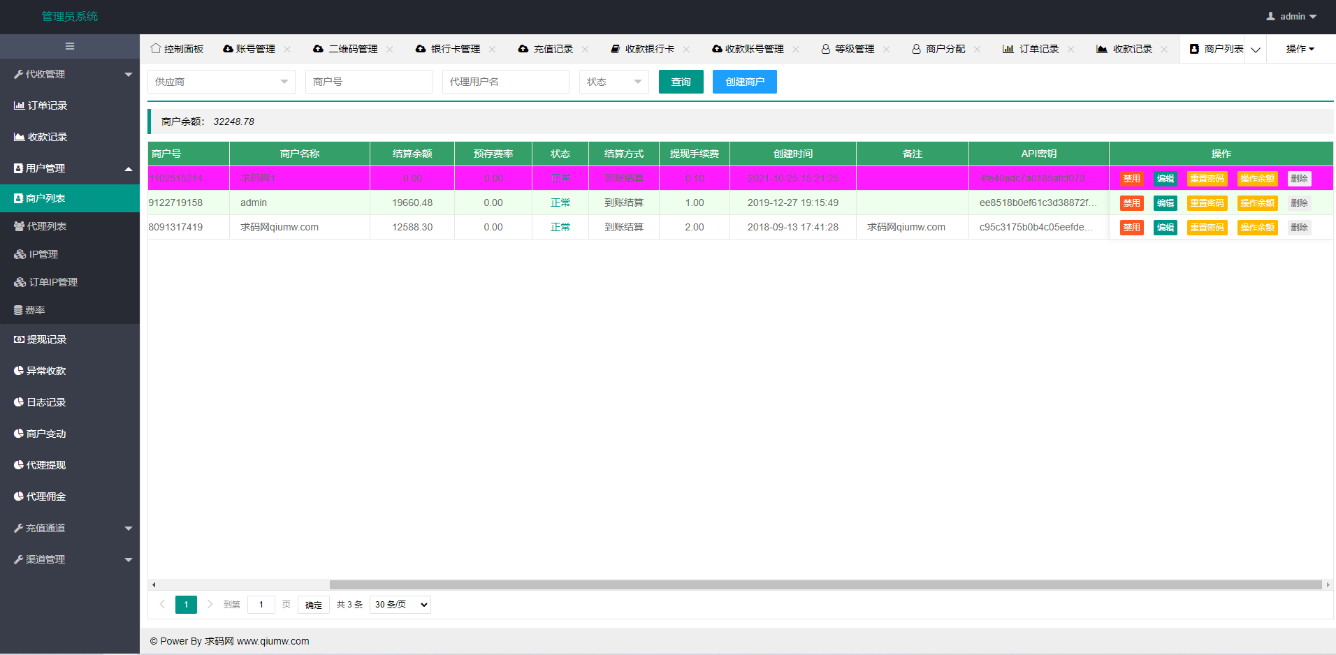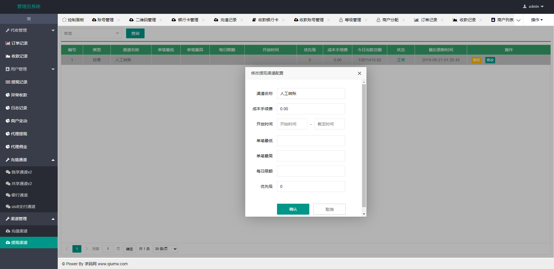 支持通道配置、商户结算、订单管理、风控设置与财务报表。