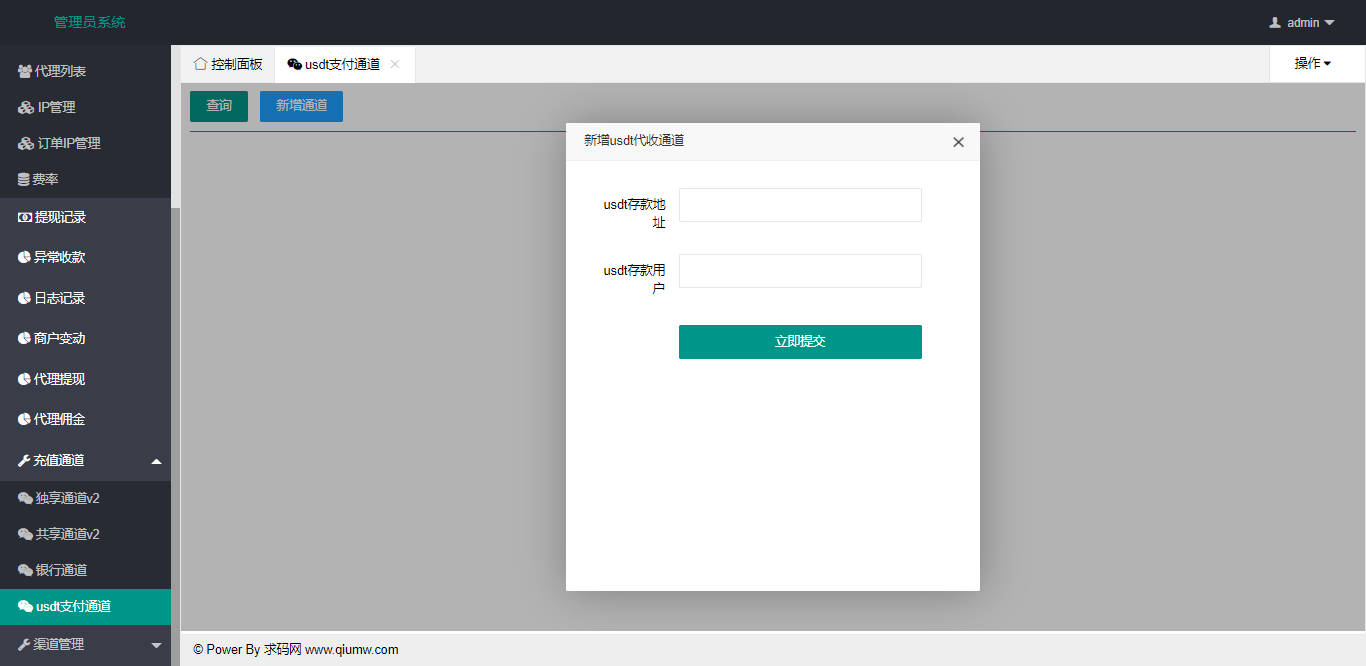 系统完美支持 USDT代收通道,兼容ERC20/TRC20协议。