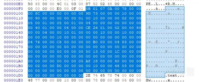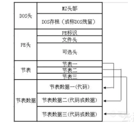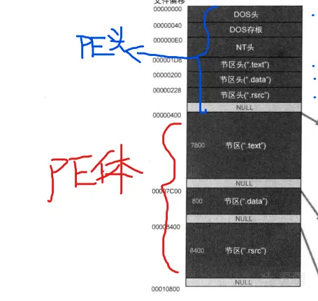从DOS头到节区头是PE头部分,其下的节区合成PE体。