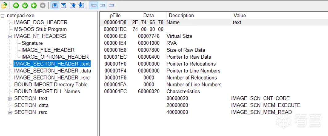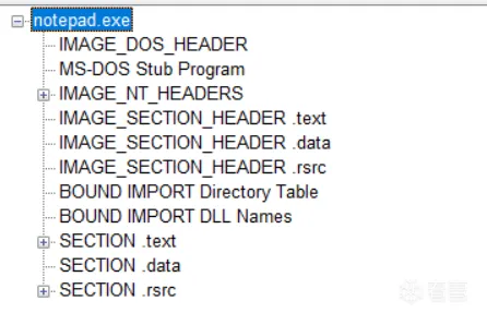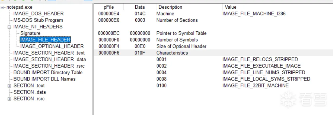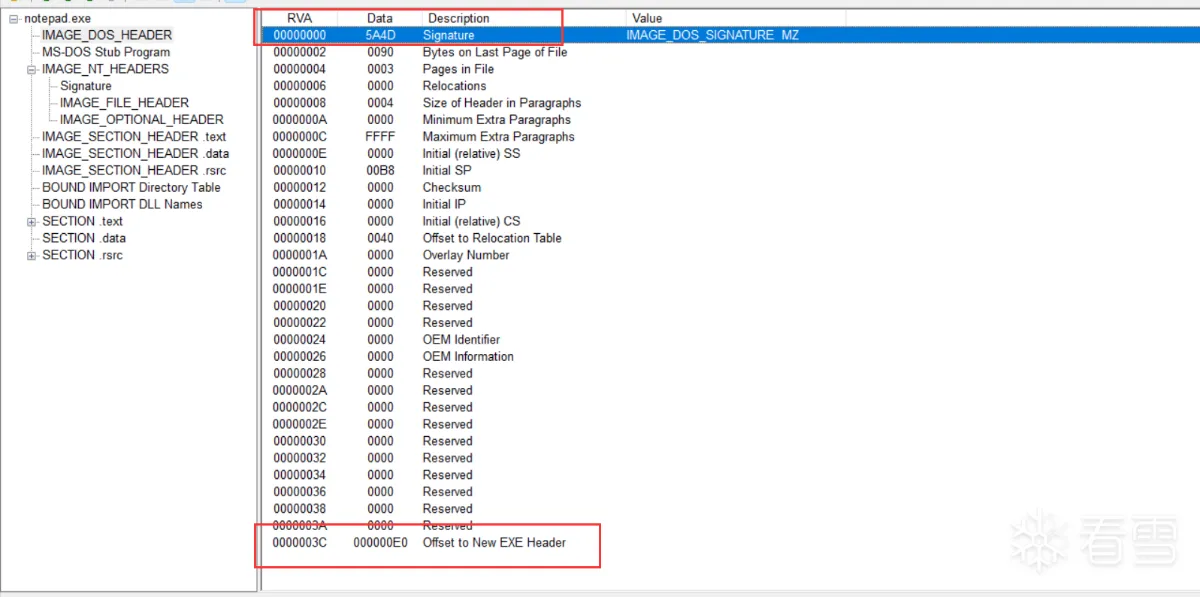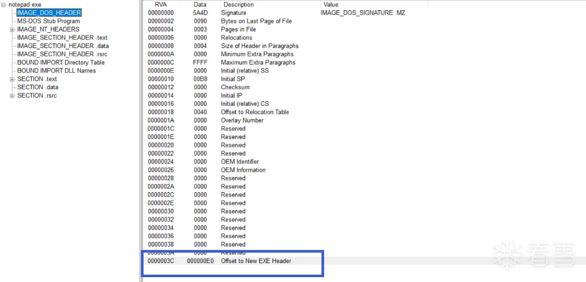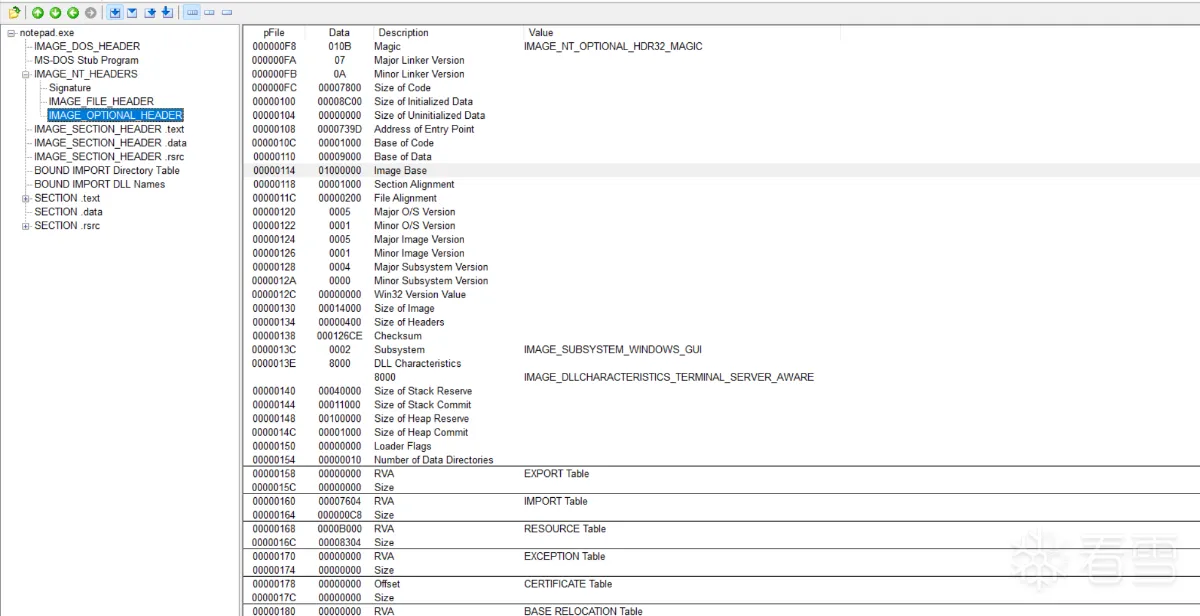 我们学习PE文件就是学习这些结构体,先对结构体来个介绍。我们可以通过PEView查看pe文件,将notepad.exe拖入。我们先来分析一下存储时的PE文件,没错PE文件运行时和在硬盘中存储时是不同的。
