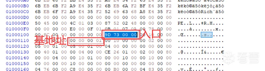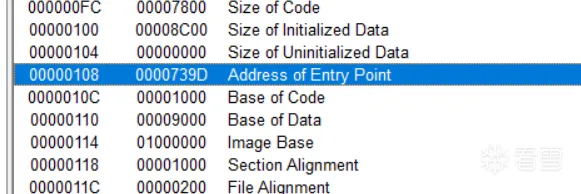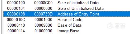 记录代码开始的位置,记录的是相对Image Base的距离。PE文件在内存中展开后最前面都是数据,需要一个值告诉操作系统从哪里开始运行。