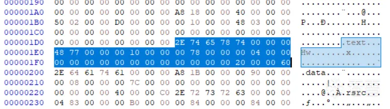 RVA是80B0,查了一下在rdata段,rdata段的起始RVA为6000,所以相对地址就是20B0,rdata段的pointer to raw data及文件偏移地址为5000,所以他的FOA为70B0,大小是5B字节。