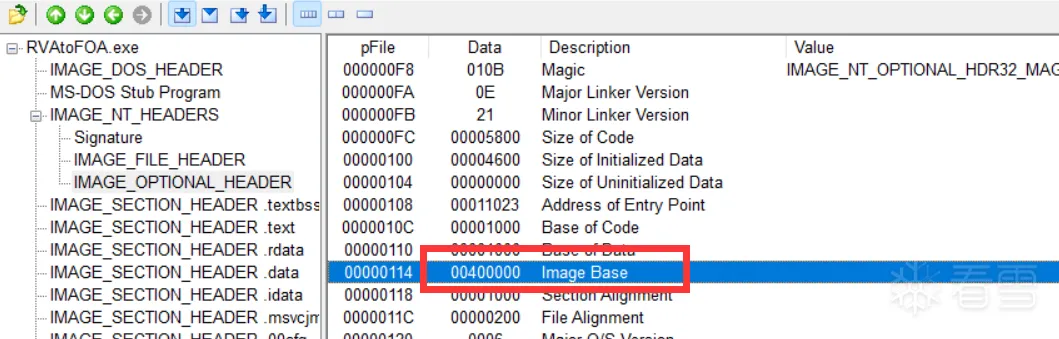 4字节,内存镜像基址。对于32位机器,操作系统会位每个进程分配一个4GB的虚拟地址空间,之所以是4GB,是因为32位操作系统指针长度为4字节32为,所以寻址能力是2的32次方。该成员指明程序在虚拟地址空间的何处展开,即基地址。