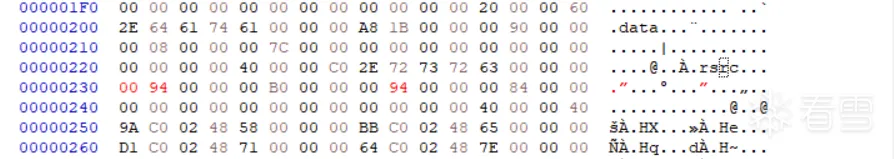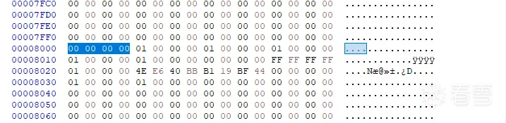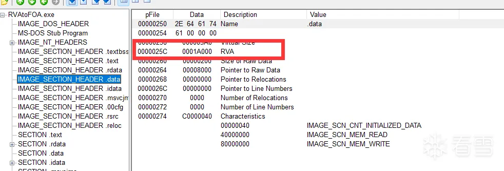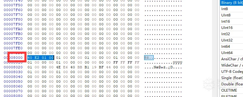 此处的RVA即在文件中的偏移量,由此我们确定全局变量在data节中,差值为0,那么我们查看该节在文件中的位置即Point to Raw Data=8000.跳转到此处,其值为0001E240即十六进制的123456