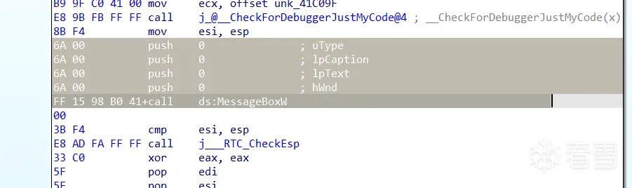 功能呢就是弹出一个这样的错误窗口。这个程序的核心就是调用了一个messagebox函数弹出了一个窗口。由于我们是要对pe文件进行操作,所以肯定不是将代码写入,而是要将机器码插入。就是利于栈传第四个参数0,然后call。