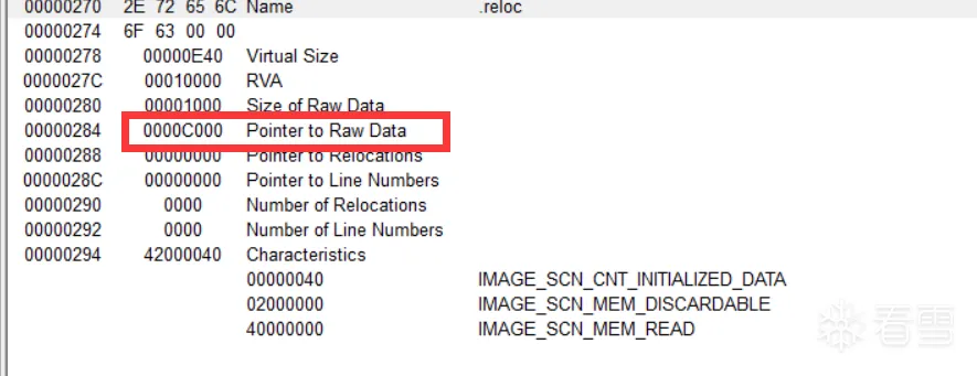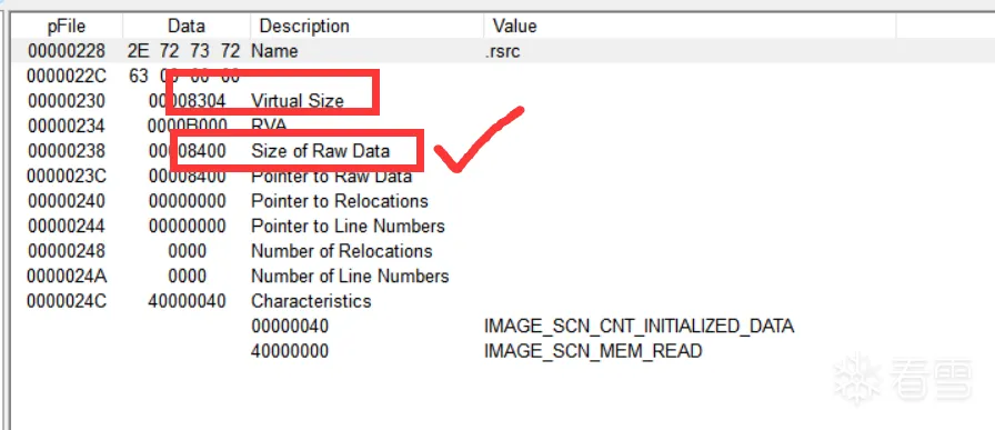 当前这个节未对齐时的大小,即实际大小。实际大小有可能会比Size of Raw Data大,因为未初始化的全局变量在文件中是不占空间的。在内存中展开时以什么为基准呢?答案是谁大按谁,如果Vitual Size>Size of Raw Data,则按照Vitual Size展开,反之则按照Size of Raw Data。
