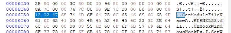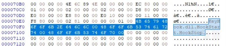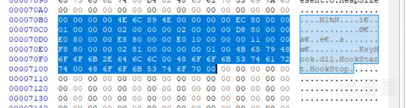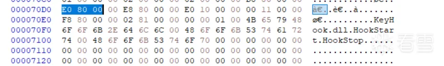 首先查到AddressOfNames的RVA为80D0,那么FOA是70D0,第一个成员80F8注意这是RVA,换算成FOA是70F8,对应可以看到“HookStart”,后面一个是8102,换算成FOA是7102,对应“Hookstop”