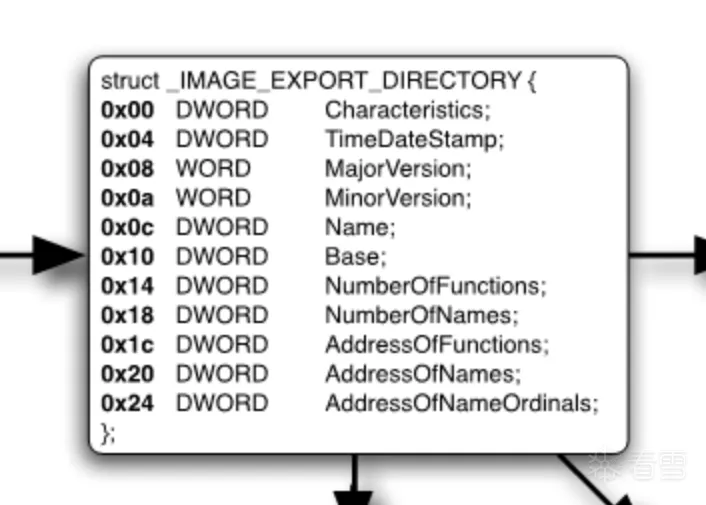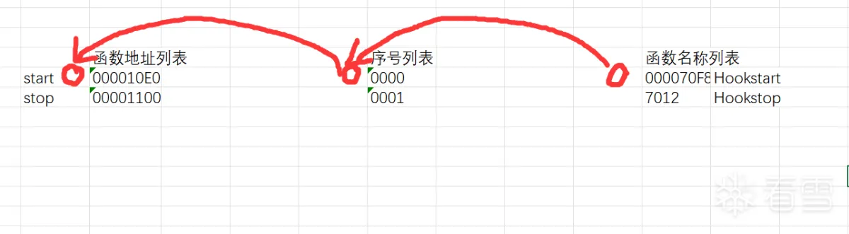当API通过函数名调用函数,比如说它调用了hookstart,那么它会前往函数名称列表获得hookstart的索引值0,之后会去序号列表,序号列表下标为零的值是0,拿到这个0再去函数地址列表充当索引最终找到函数的地址。有时候不是通过函数名而是通过函数序号查找函数,这就要用到刚才没介绍的一个成员Base,它的值是函数地址列表的起始序号,如果其实序号为10,所调用的函数的序号是11,那么第二个成员hookstop的序号对应为11,完成调用。