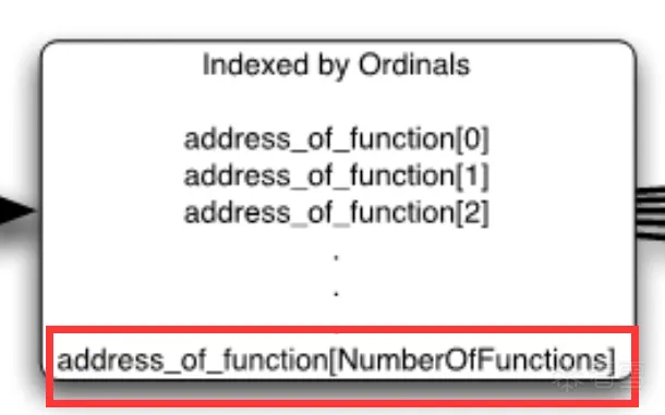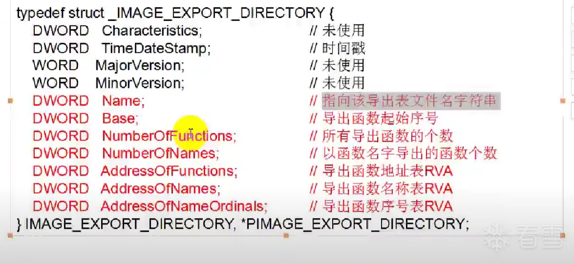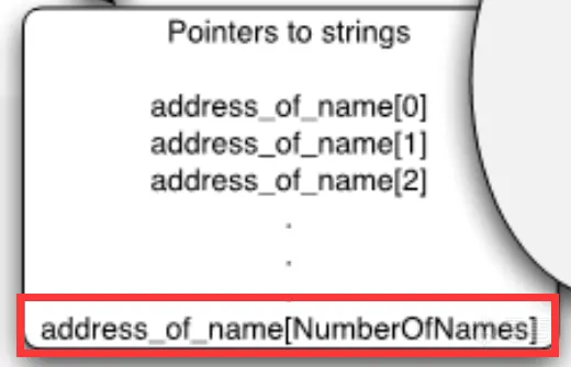 导出函数名称表。存储的函数名称所在的地址。每个成员四字节大小。