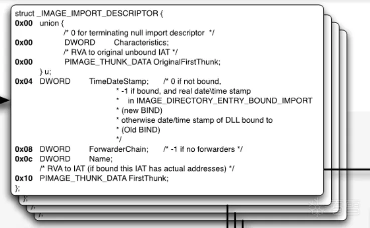 这个联合指向的是IMAGE_THUNK_DATA结构体,这些结构体组成INT(import name table),要用到该模块的几个函数,就有几个IMAGE_THUNK_DATA结构体,每个结构体大小是4字节,当出现连续的4字节为0,则说明INT截止。