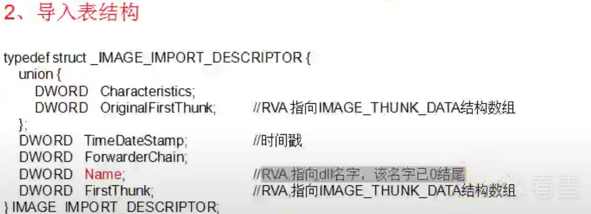 完整的理一遍,首先通过扩展pe头的左后一个成员import table找到了导入表,导入表的第四个成员是个RVA指向了kernel32.dll字符串,这是导入的模块的名称,通过导入表的第一个成员(一个RVA指向)IMAGE_THUNK_DATA,该成员的最高位不为1,说明是个RVA,通过这个RVA找到了importbyname,通过该成员的第三个字节找到了导入的这个模块所使用的一个函数GetModuleFileNameA
