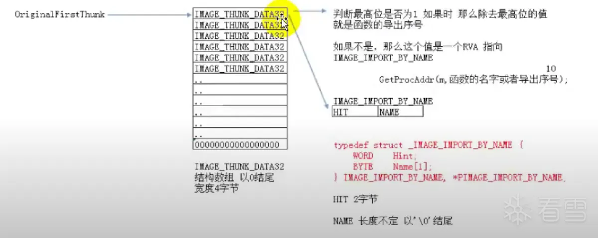 如果,IMAGE_THUNK_DATA第一位为1,则说明它是序号,是前面导出表提到的函数序号列表的内容,对应的是要导入的函数没有名字只提供了序号。