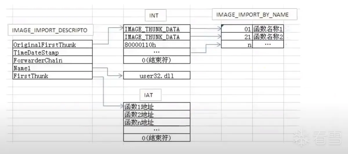 PE文件加载前后,IAT(import address table)导入地址表发生变化,IAT不在指向函数名称,而是已经根据函数名称更换了表格。INT那里相当于一层保险,当程序IAT被修改(脱壳时就要修复导入表),无法找到函数时,可以根据INT和相关函数得到函数地址,从而修复IAT。