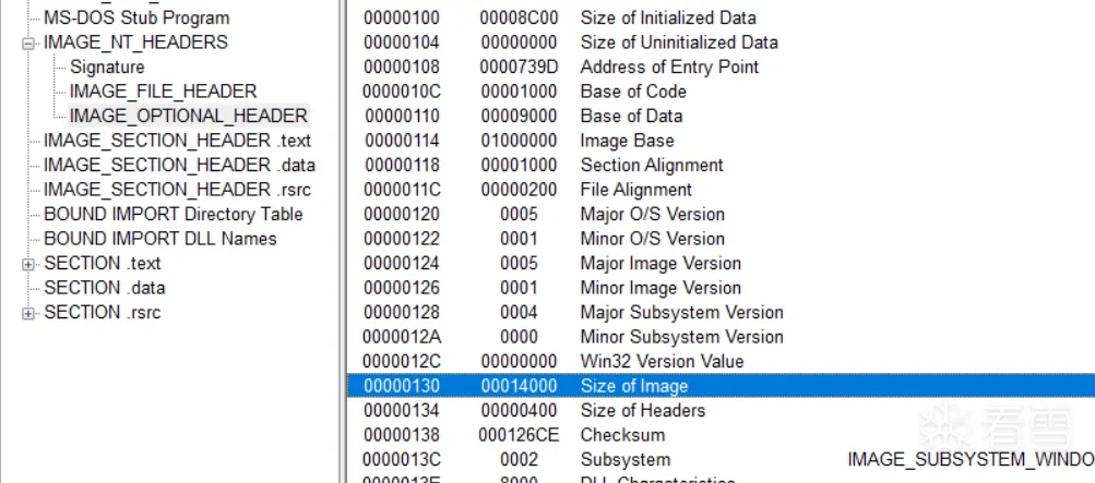 3.修改Size of Image(扩展pe头成员)即文件在内存中展开后的大小。SizeofImage就是内存对其后的大小。