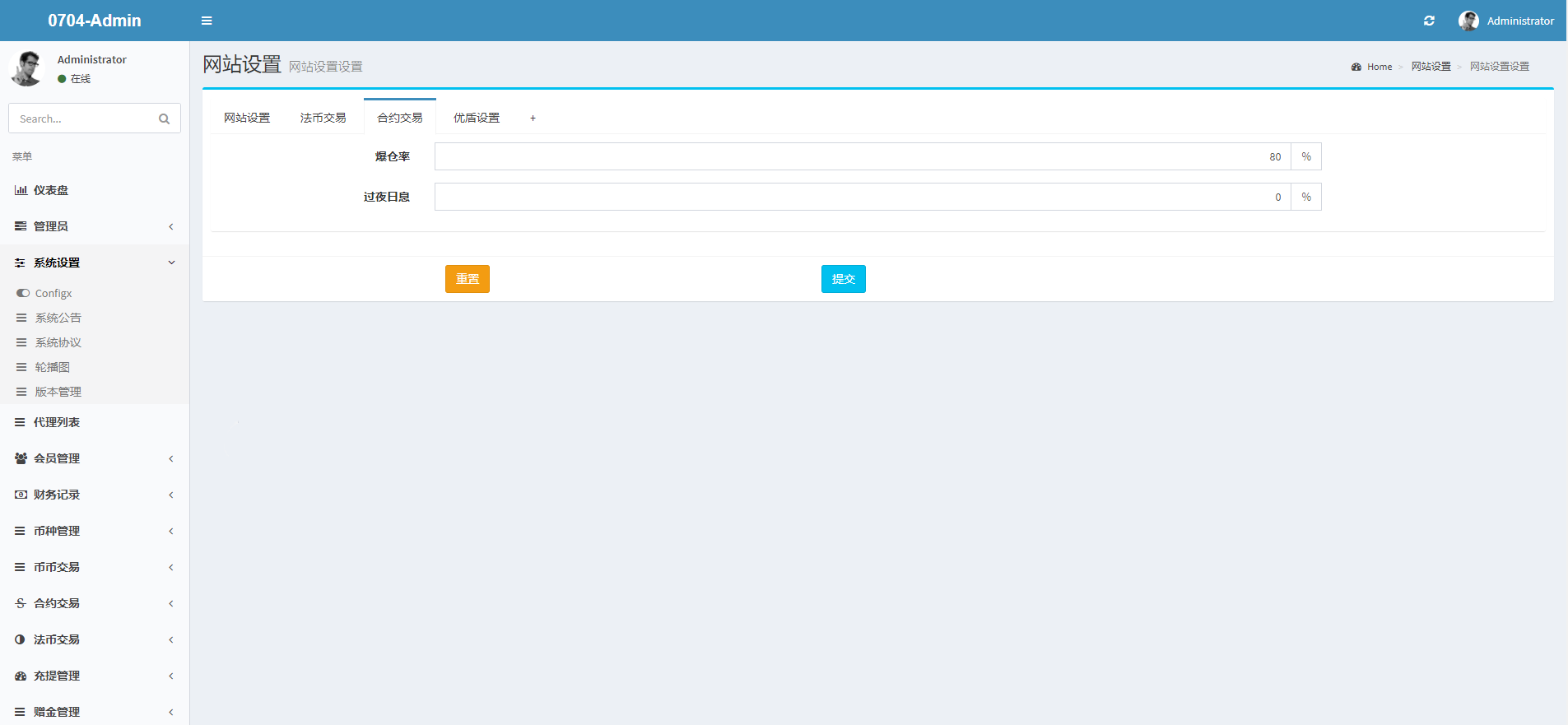 合约交易管理(委托记录,持仓记录,平仓记录,爆仓率、过夜日息设置)