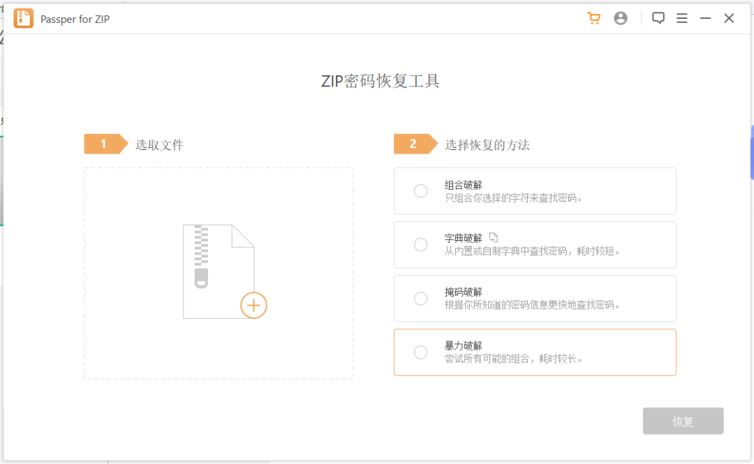 Passper forRAR/ZIP/Excel/word是一款简单好用的快速rar/zip/Excel/word密码恢复工具,如果您忘记了您的压缩文件解压密码或者是下载了根本不知道密码,没关系,本工具帮助你轻松搞定问题,您只需要添加您的文件,选择一个合适的恢复方法,恢复方法是根据实际情况来选择的,如组合破解是只组合你选择的字符来查找密码。