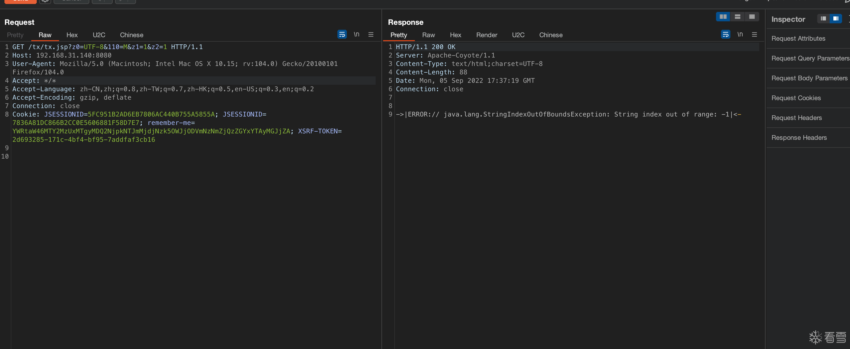 GET /tx/tx.jsp?z0=UTF-8&110=M&z1=1&z2=1 HTTP/1.1Host: 192.168.31.140:8080User-Agent: Mozilla/5.0 (Macintosh; Intel Mac OS X 10.15; rv:104.0) Gecko/20100101 Firefox/104.0Accept: */*Accept-Language: zh-CN,zh;q=0.8,zh-TW;q=0.7,zh-HK;q=0.5,en-US;q=0.3,en;q=0.2Accept-Encoding: gzip, deflateConnection: closeCookie: JSESSIONID=5FC951B2AD6EB7806AC440B755A5855A; JSESSIONID=7836A81DC866B2CC0E5606881F58D7E7; remember-me=YWRtaW46MTY2MzUxMTgyMDQ2NjpkNTJmMjdjNzk5OWJjODVmNzNmZjQzZGYxYTAyMGJjZA; XSRF-TOKEN=2d693285-171c-4bf4-bf95-7addfaf3cb16 |