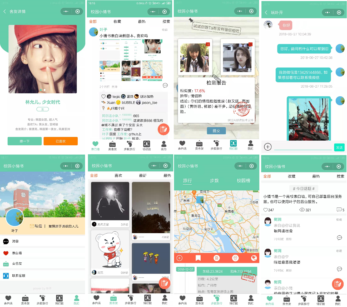 功能主要分为:表白墙、卖舍友、步数旅行、情侣脸、我的,大致功能都在图上了。