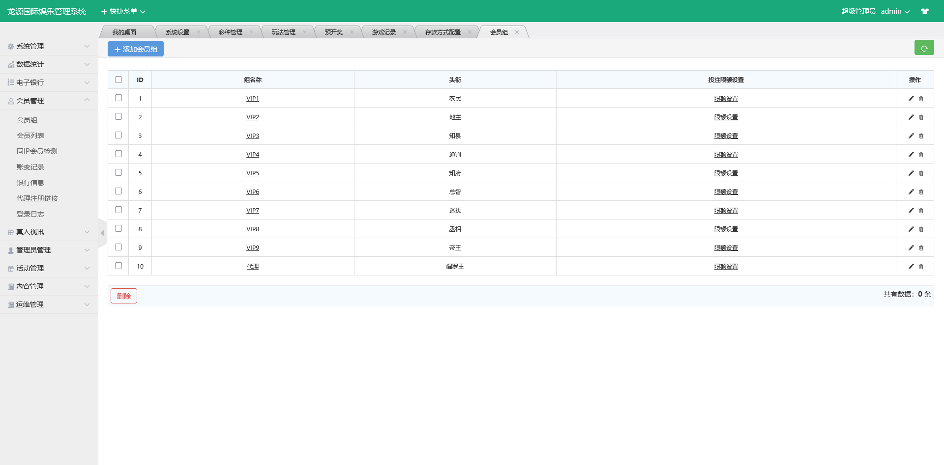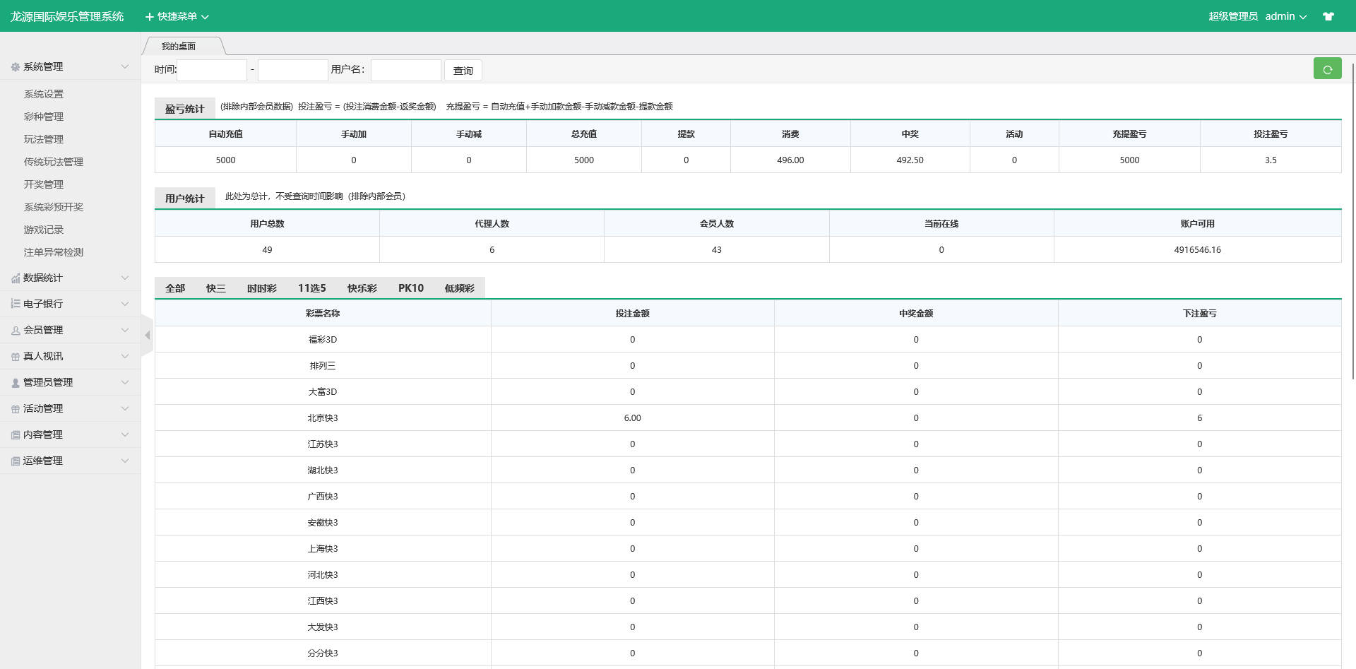 支持:会员管理、盈亏统计、下注明细、代理返点、资金报表、公告推送等完整运营功能。