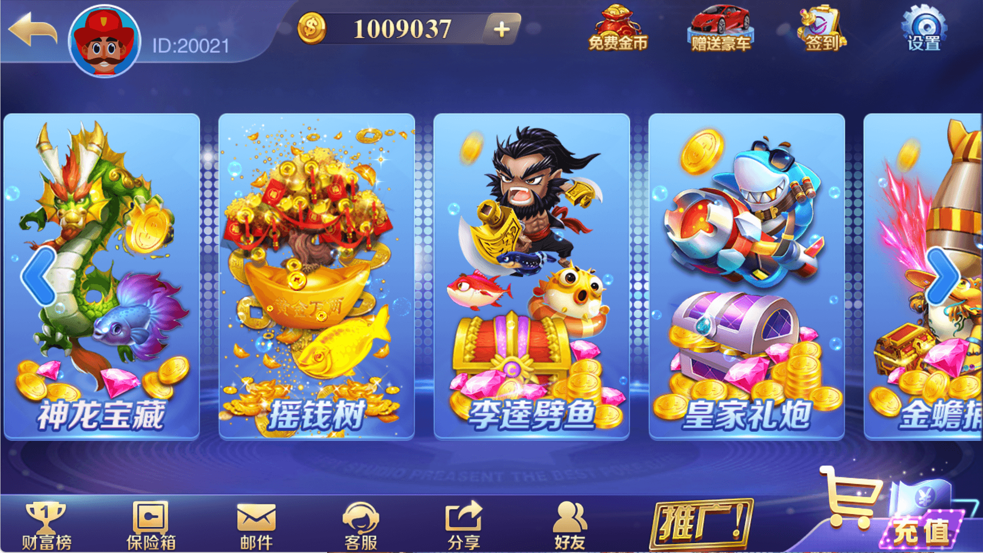 神龙宝藏、摇钱树、李逵劈鱼、皇家礼炮、金蟾捕鱼、淡水鱼、海王2