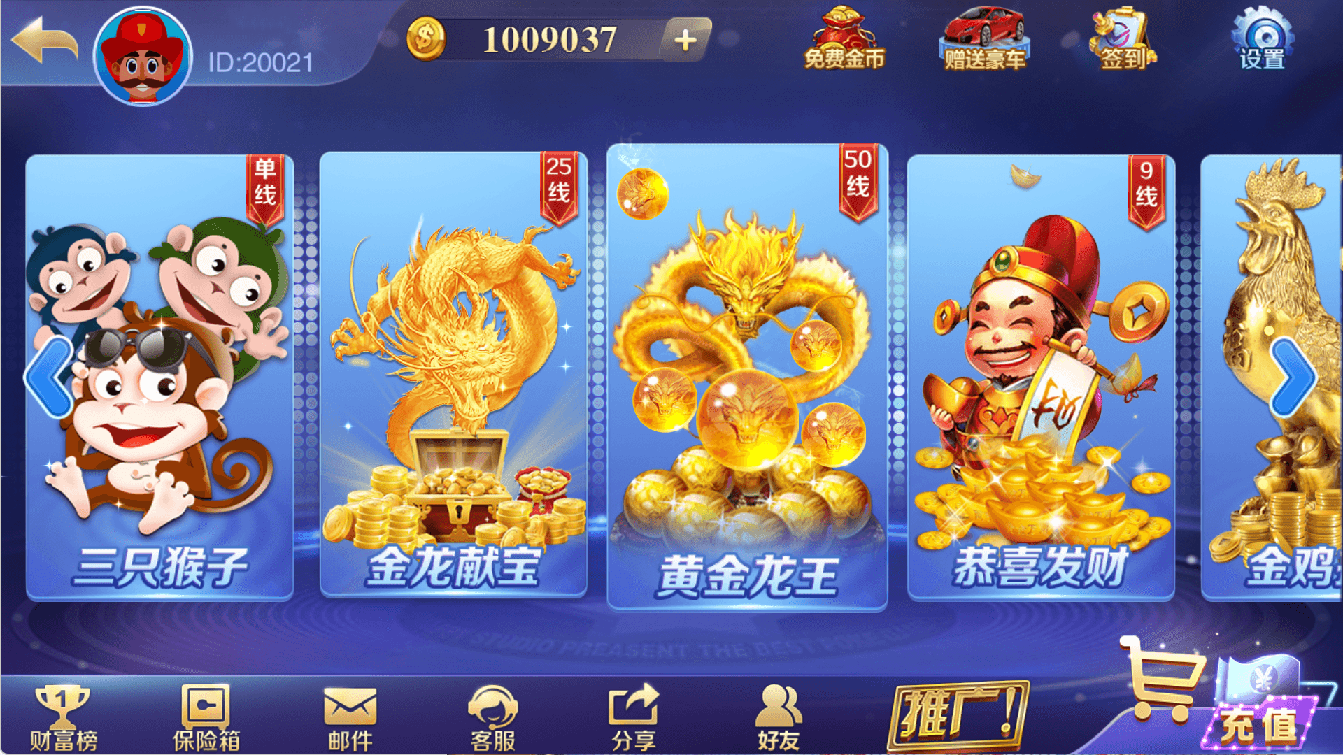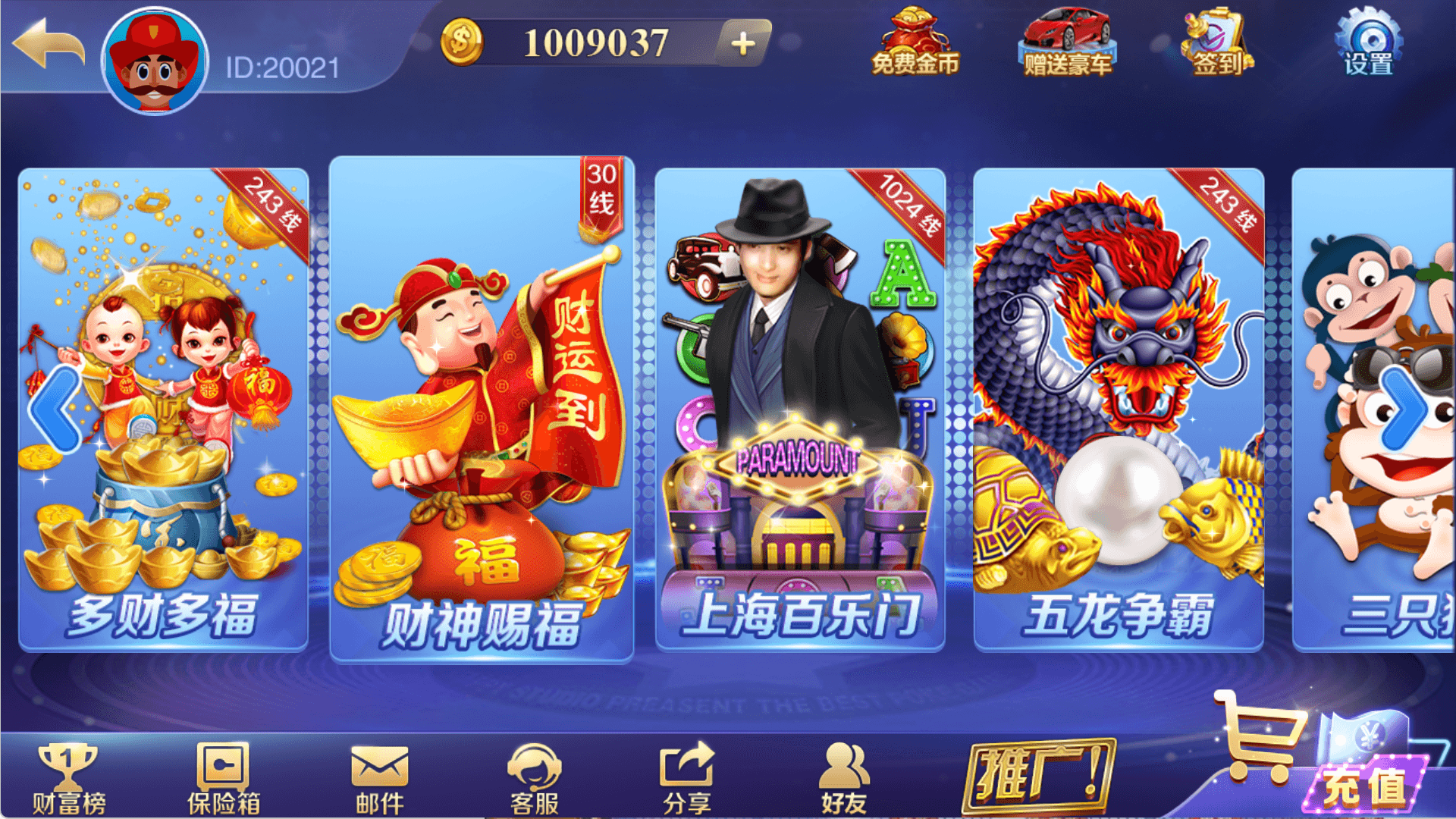 玉蒲团、疯狂的7、武财神、疯狂的猴子、疯狂麻将、火焰连击、多财多福、财神赐福、上海百家门、五龙争霸、三只猴子、金龙献宝、黄金龙王、恭喜发财、金鸡报喜、水浒传、吉祥如意