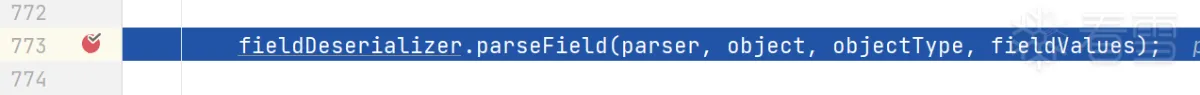 这个函数进去之后,可能没办法继续步入了,不过可以直接将断点打至JavaBeanDeserializer的773行: