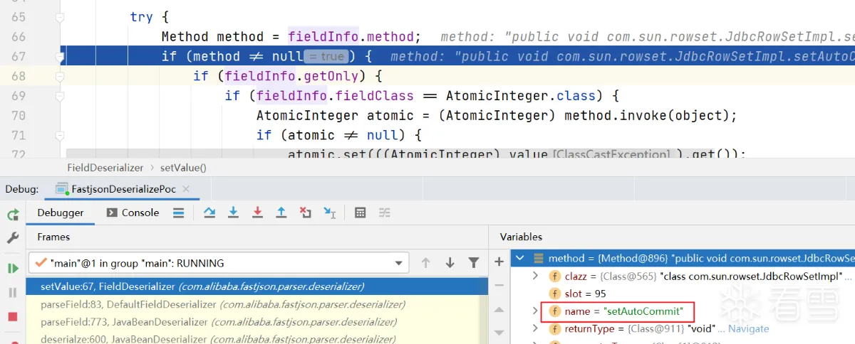 此时将反序列化JdbcRowSetImpl类中的autoCommit字段,是一个boolean类型的字段,反序列化出的value是true。