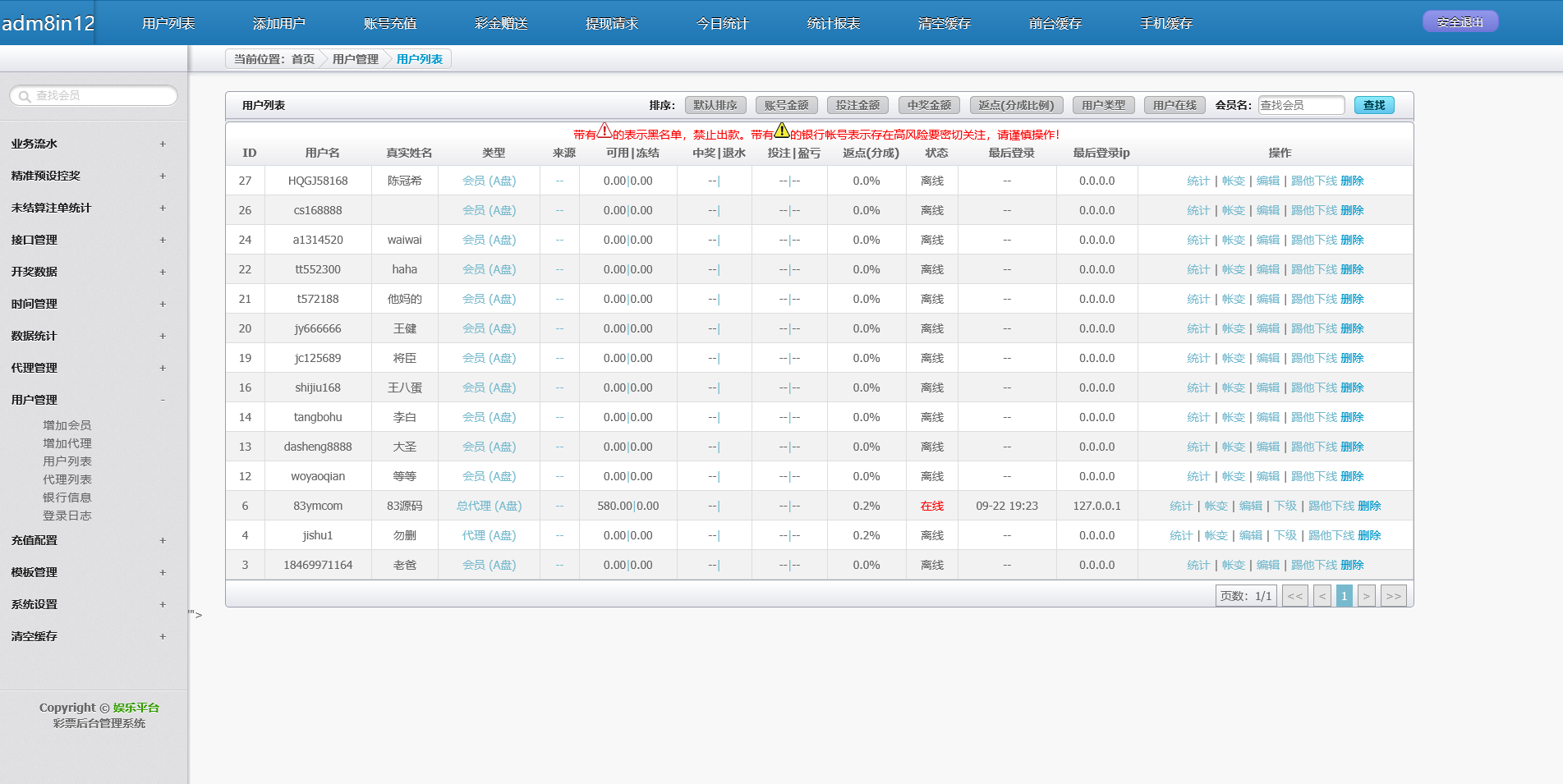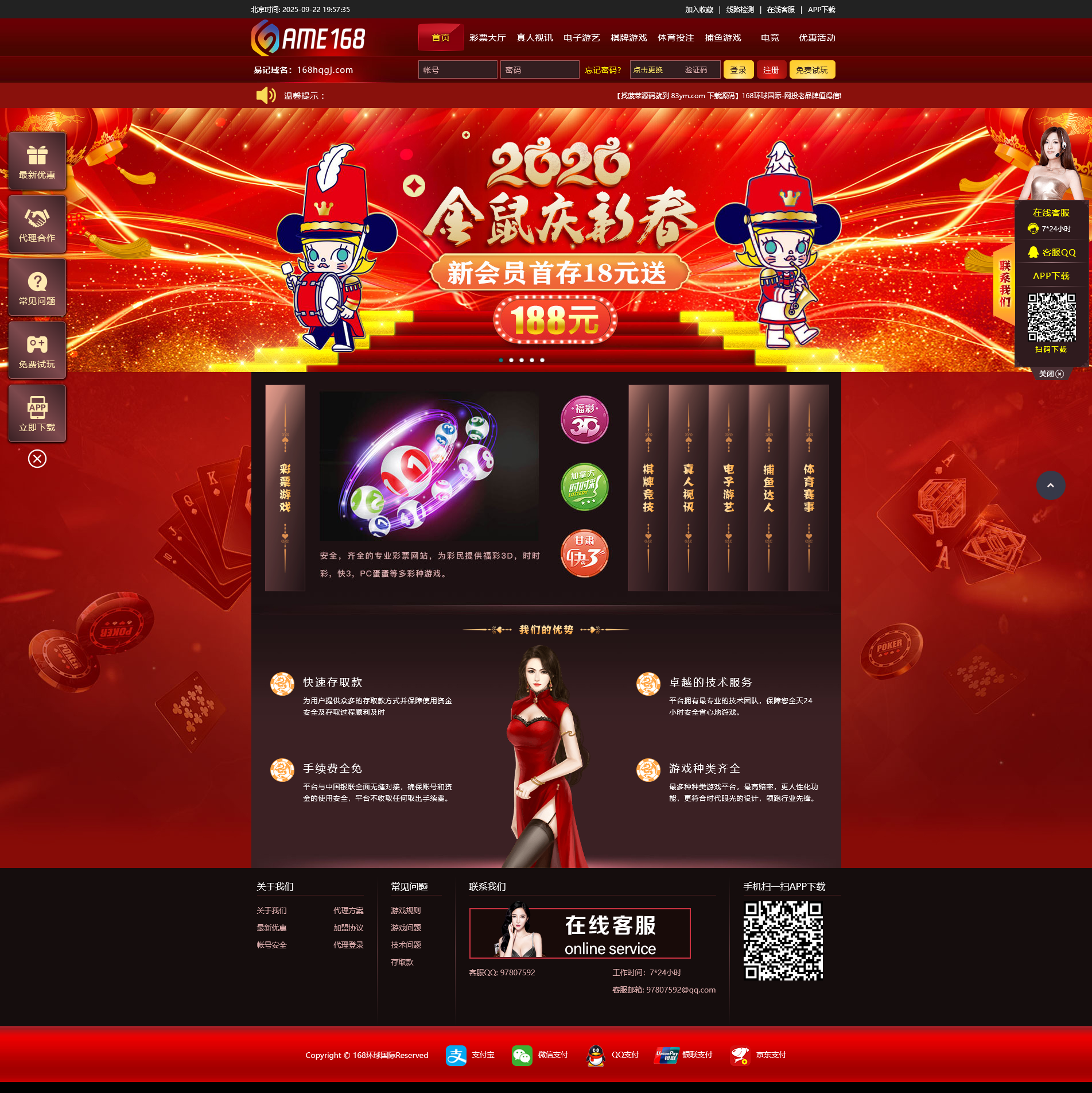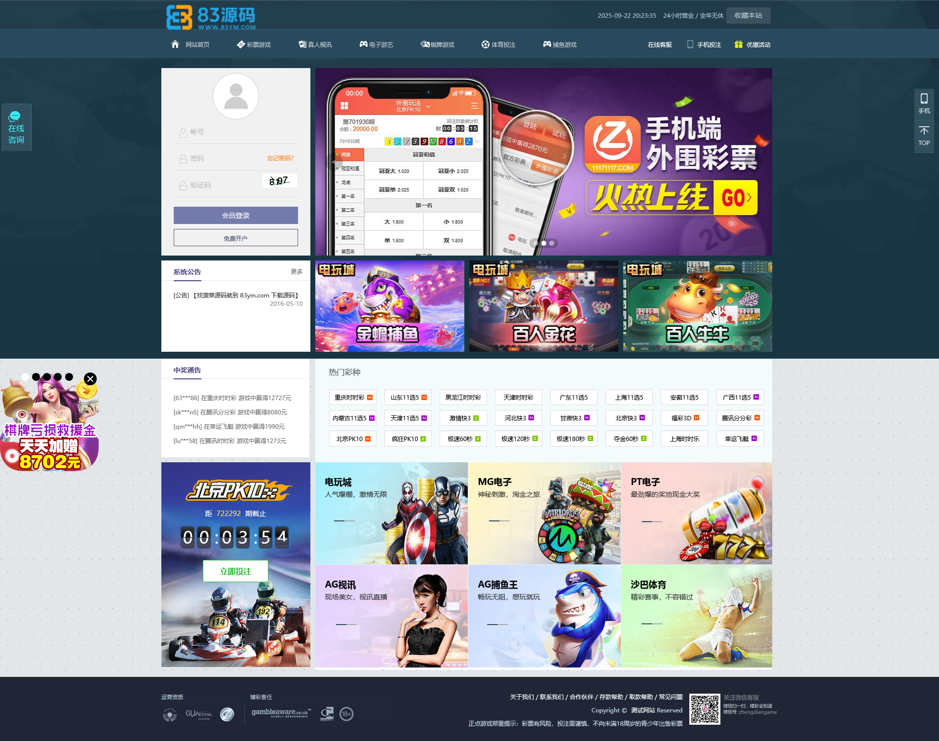 天恒框架二开的 168欢乐彩票系统,是一套功能完善的 时时彩平台系统。该版本集成 NG接口,支持web+wap端,时时彩有番摊、百家乐、德州扑克、三公等玩法,后台支持 修改订单、预设开奖,并内置 独立代理系统,适合搭建与运营多层级的彩票平台业务。