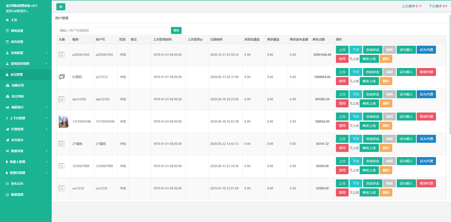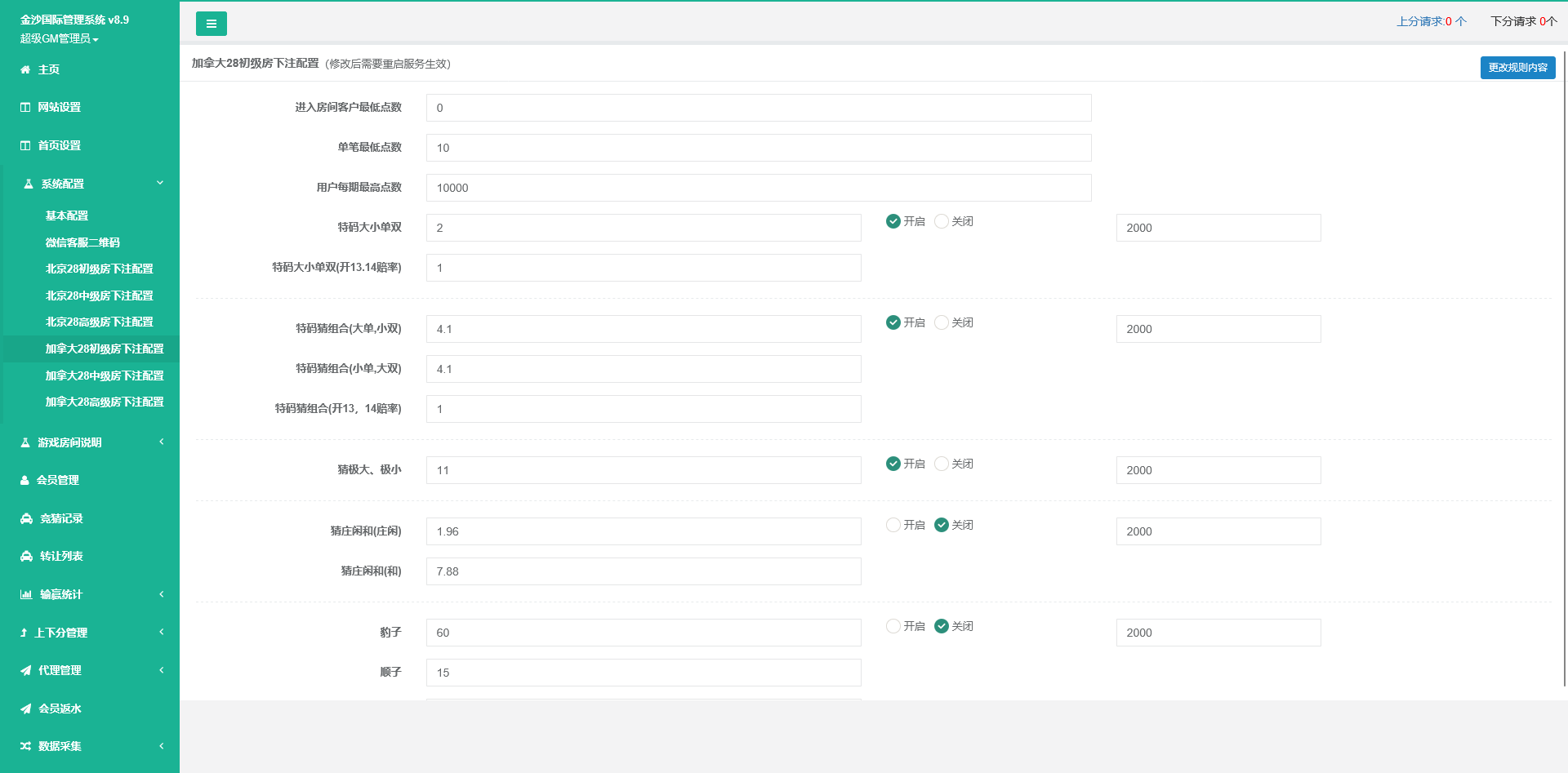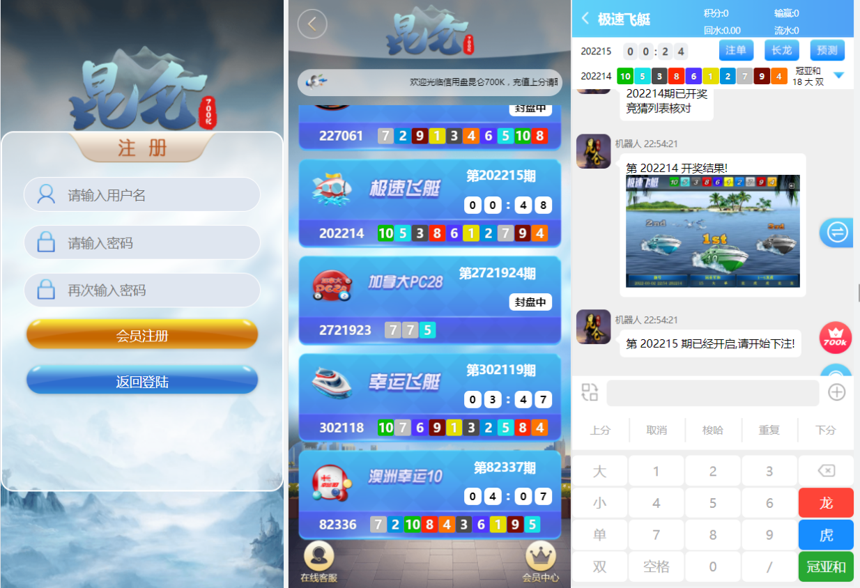 后台管理功能:开奖控制、赔率设定、数据统计、用户分级