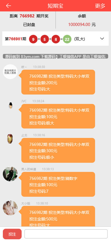 NG28 金沙国际二开源码,结合 28 投注模式 与 理财玩法,创新推出长期宝、短期宝投资系统。多房间、多语言聊天室增强了互动体验,配合独立代理管理后台与 APP 封装,整体功能更趋完整,是一套可用于研究、二开的综合型源码。